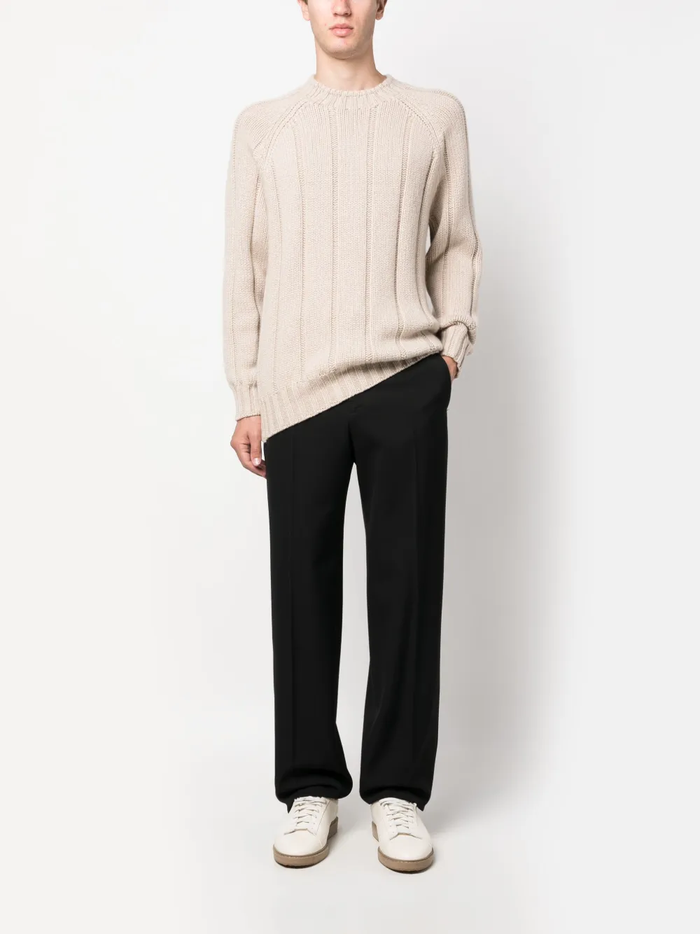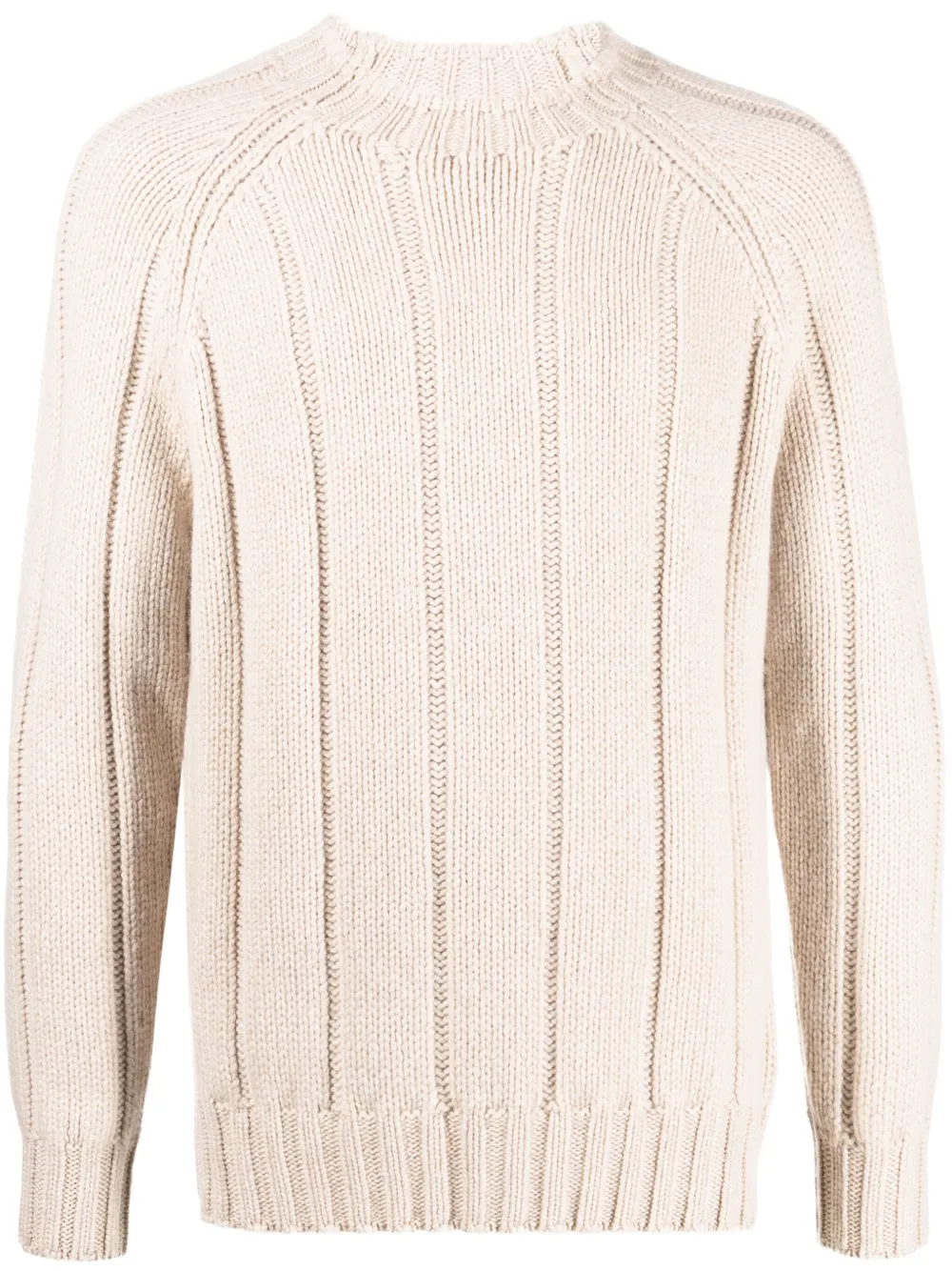 Светло-бежевый, кашемир, трикотаж в крупный рубчик, круглый вырез, длинные рукава реглан, отделка в рубчик и прямой подол.
