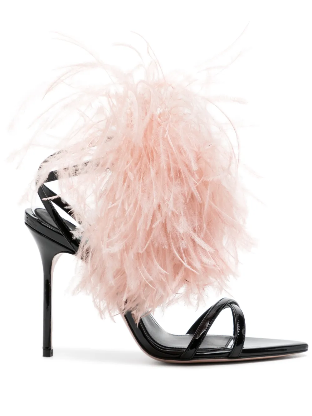 Черный, пудрово-розовый, кожа, лакированная отделка, перья, открытый носок, заостренный носок, кожаная стелька с логотипом, перекрестные ремешки, ремешок на щиколотке с пряжкой и каблук на высокой шпильке.