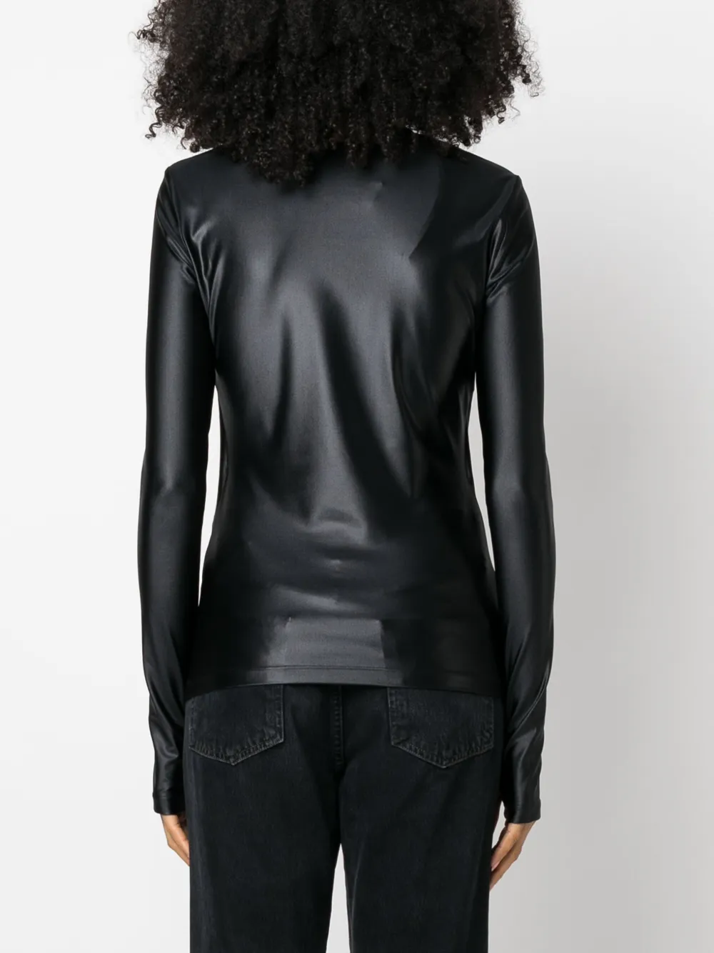 Черный, эластичный материал, строчка в тон, логотип в тон, вырезные детали, круглый вырез, длинные рукава и прямой подол.