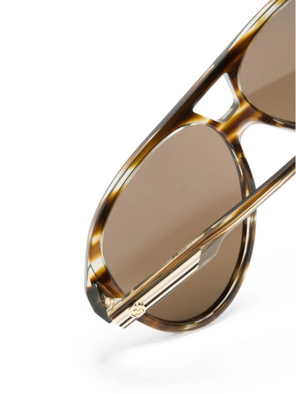 Черепаховая расцветка, логотип Interlocking G, золотистая фурнитура, оправа «пилот», коричневые линзы, защита от ультрафиолетового излучения, прямые дужки и дужки с закругленными концами. В комплект входит защитный чехол для очков.