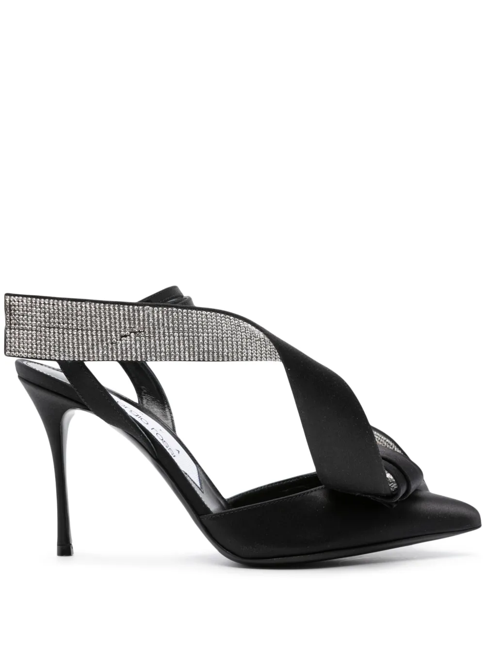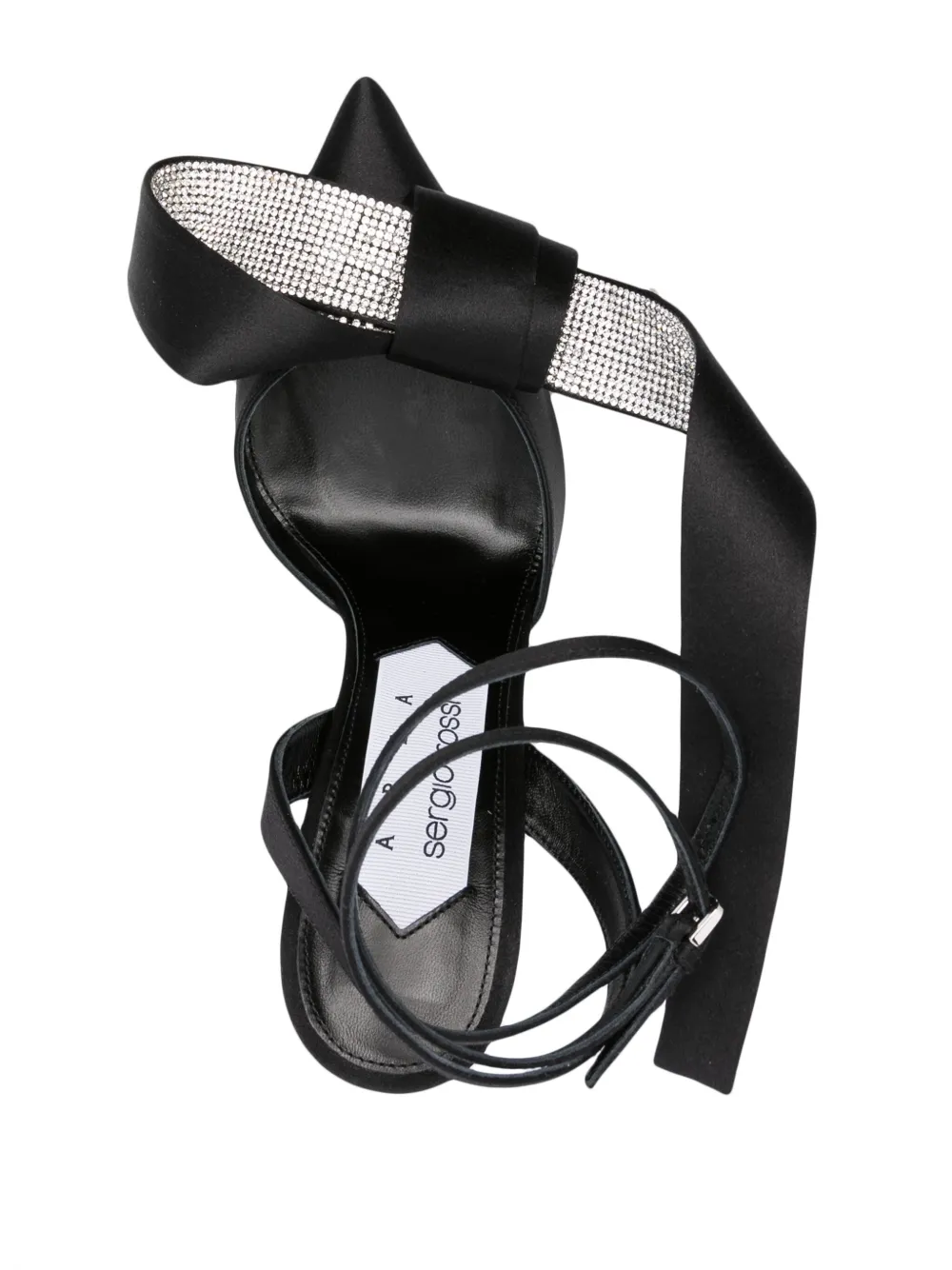 Черный, серебристый, кристалл, сатиновая фактура, украшения из горного хрусталя, крупный бант, заостренный носок, ремешок на щиколотке с пряжкой, стелька с логотипом, кожаная подошва и высокий каблук.