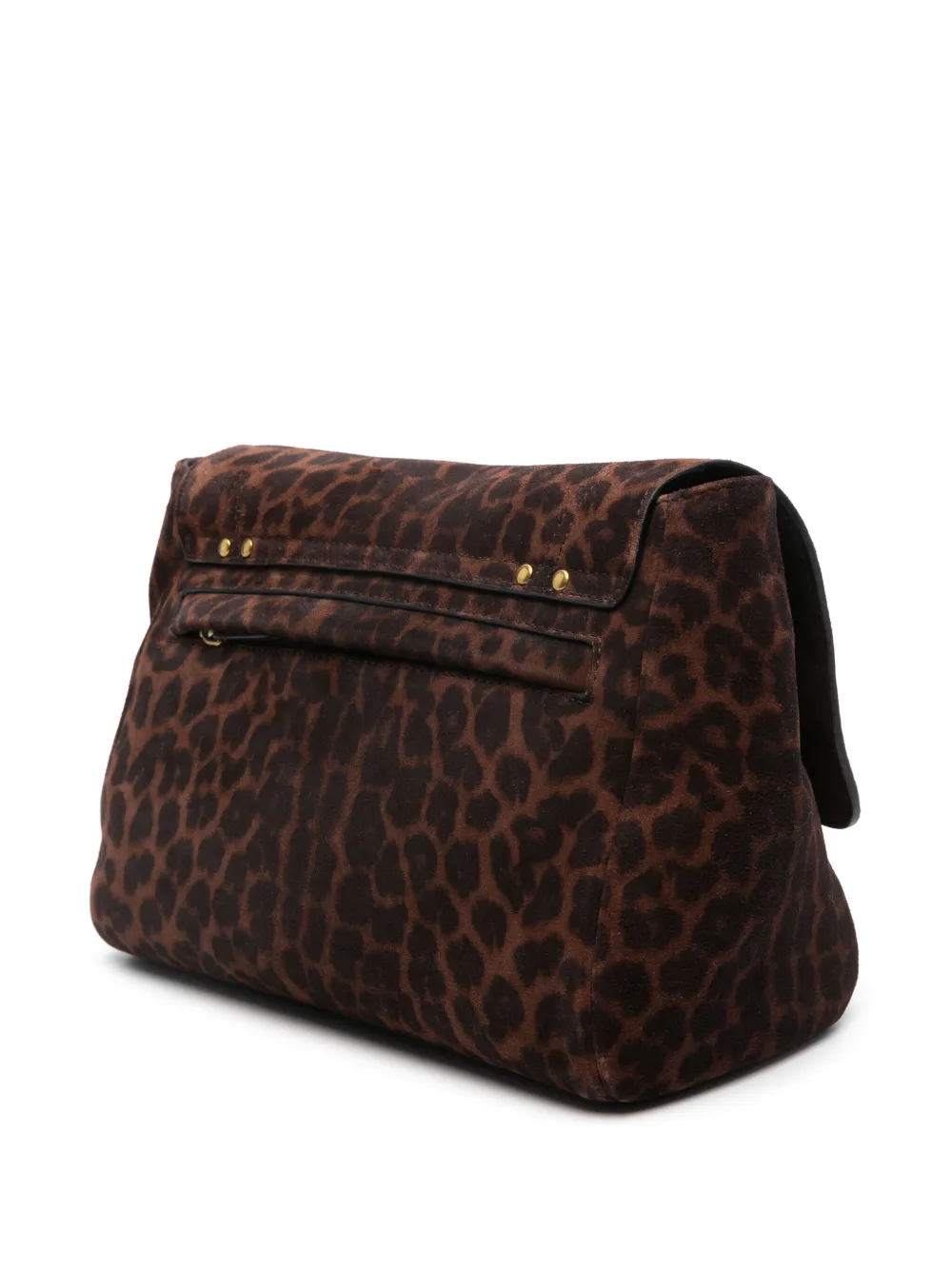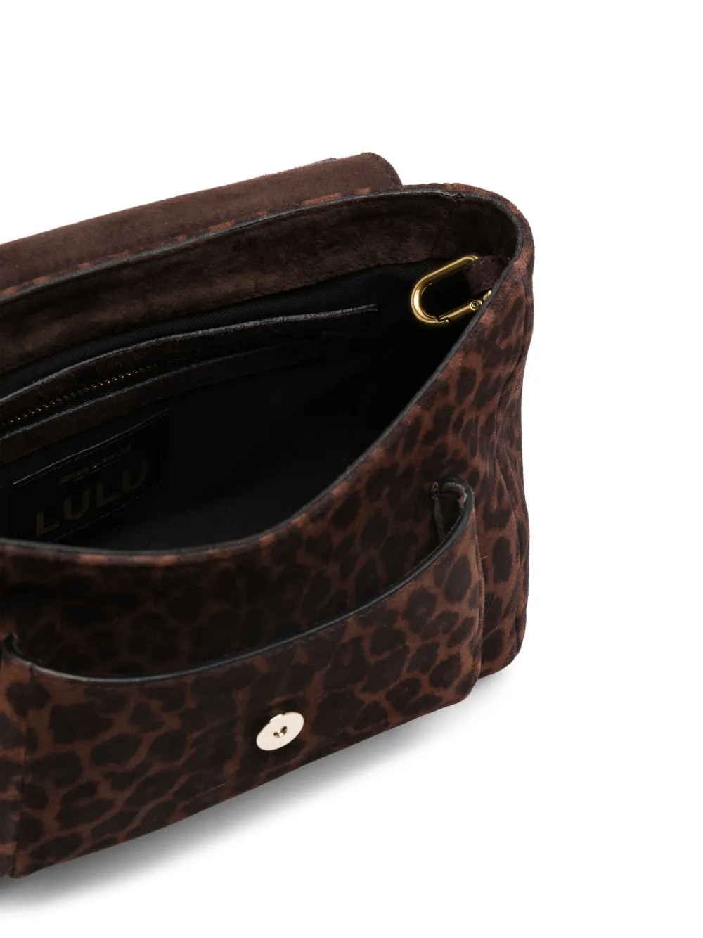 Темно-коричневый, замша из телячьей кожи, леопардовый принт, откидной клапан на магните, золотистые заклепки, золотистая фурнитура, съемный цепочный ремень на плечо, карман-муфта, основное отделение, нашивка с логотипом внутри, подкладка из хлопка и внутренний карман на молнии.