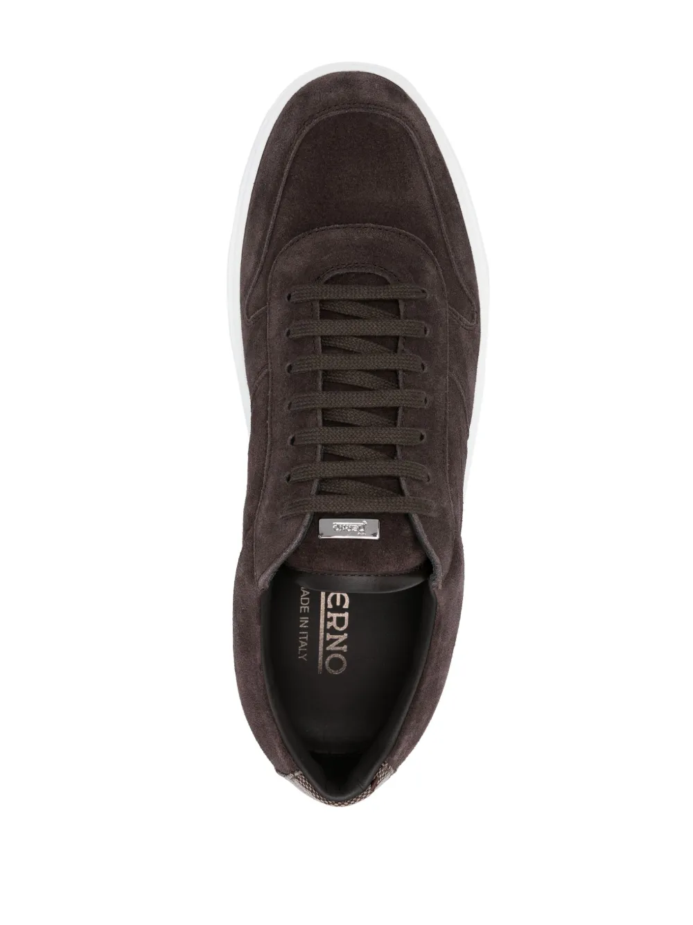 Кофейный, замша из телячьей кожи, вставки, серебристый металлический логотип, узор с изображением монограммы, задник с логотипом, закругленный носок, шнуровка спереди, кожаная стелька с логотипом и контрастная резиновая подошва.