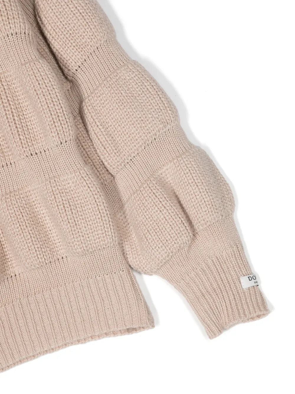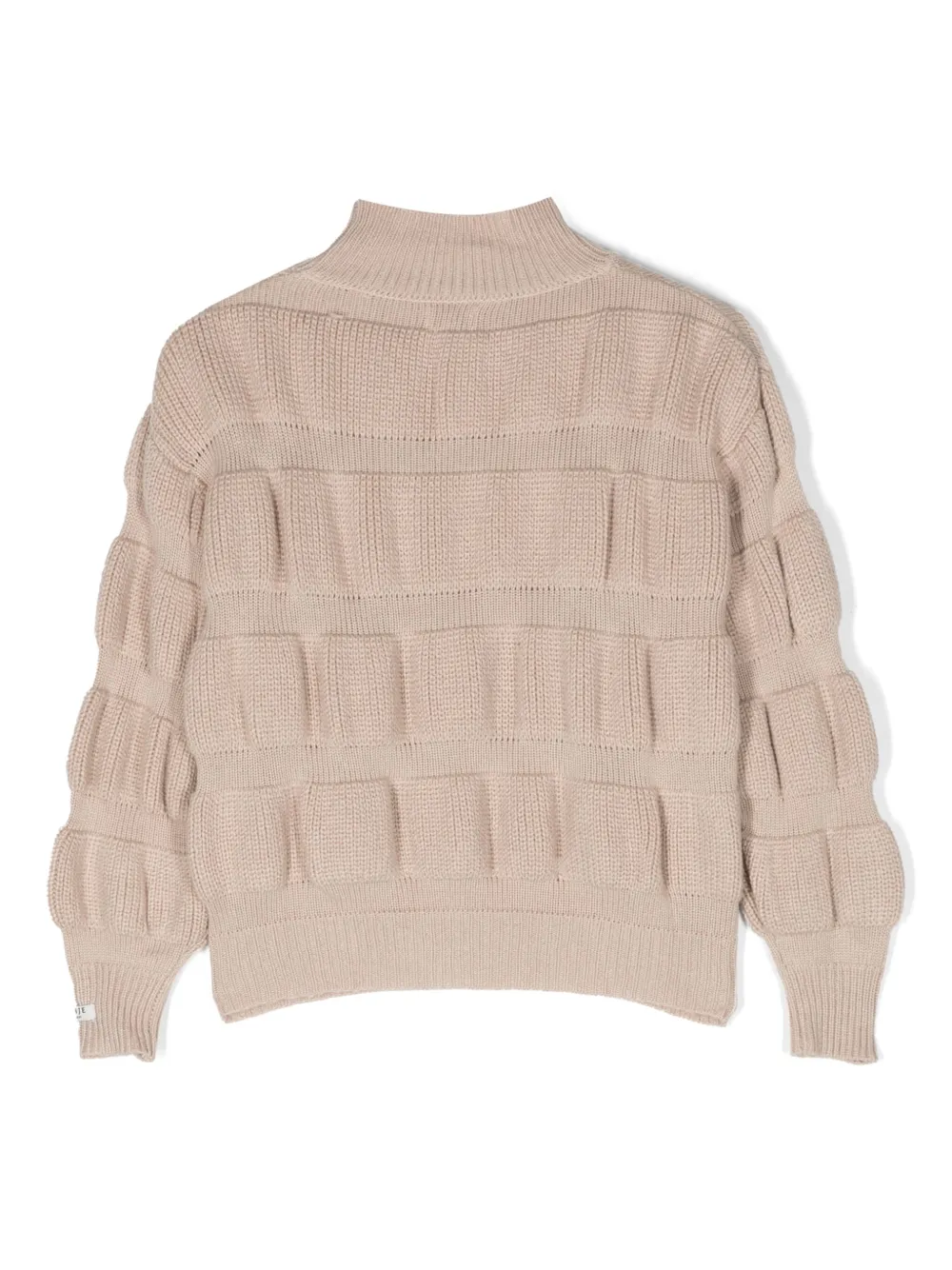 Песочно-коричневый, смесовая шерсть мериноса, тонкая вязка, высокий воротник, приспущенные плечи и длинные рукава.