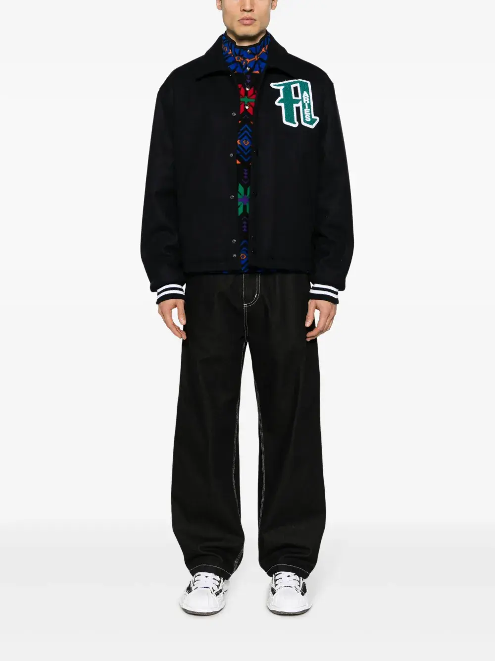 Темно-синий, смесовая шерсть, отделка в полоску, логотип-аппликация, классический воротник, застежка на кнопках спереди, длинные рукава, манжеты в рубчик, два прорезных кармана сбоку, прямой подол и стеганая подкладка.