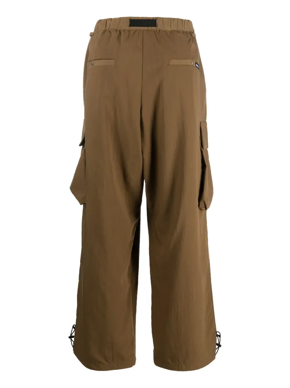 Оливково-зеленый, ремень на талии, низкий шаговый шов, два кармана карго спереди, эластичный пояс, подол с кулиской, задний карман на магнитной застежке и прямой крой.