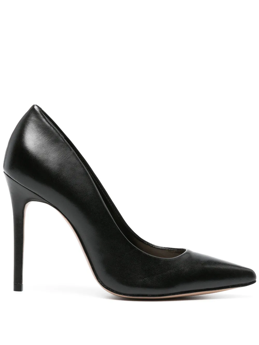 Черный, телячья кожа, модель без застежки, заостренный носок, кожаная стелька с логотипом и каблук на высокой шпильке.