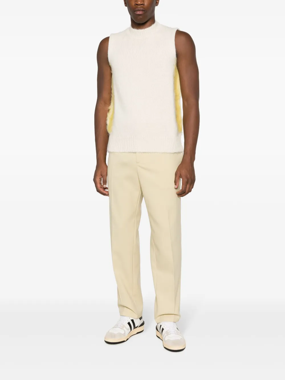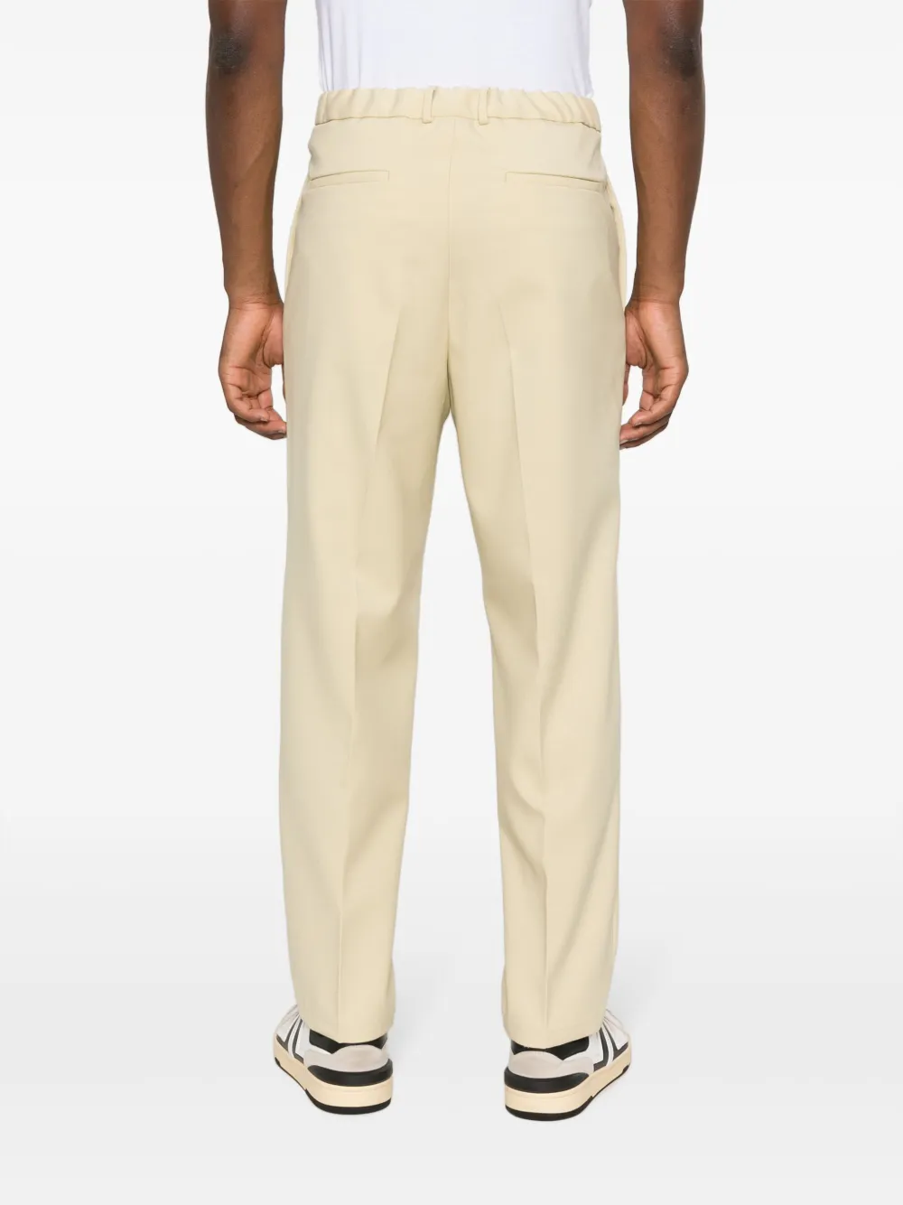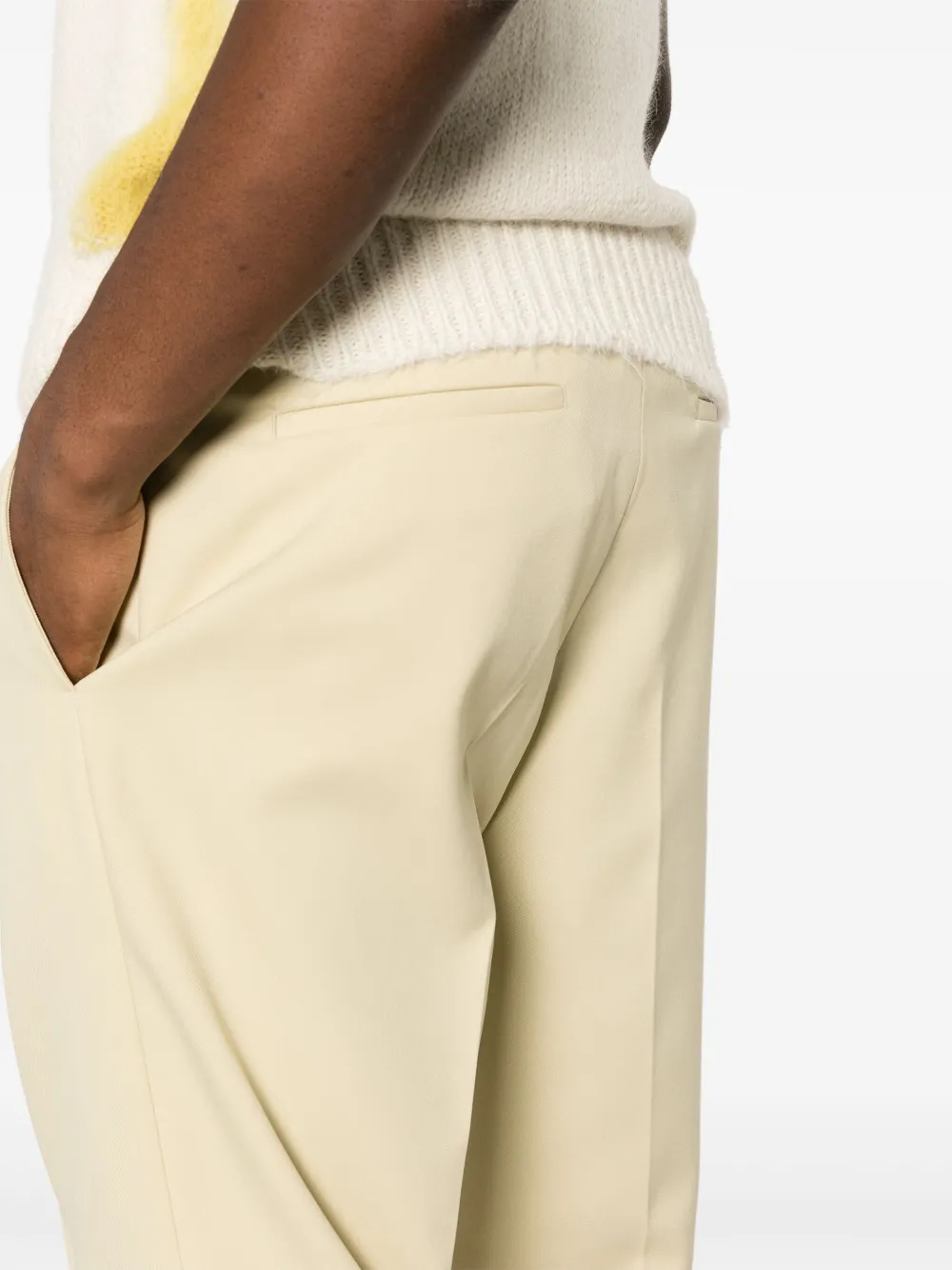 Светло-желтый, хлопок, стрелки, петли для ремня, потайная застежка спереди, эластичный пояс сзади, средняя посадка, прямой крой, два вшитых кармана по бокам и два кармана с листочкой сзади.