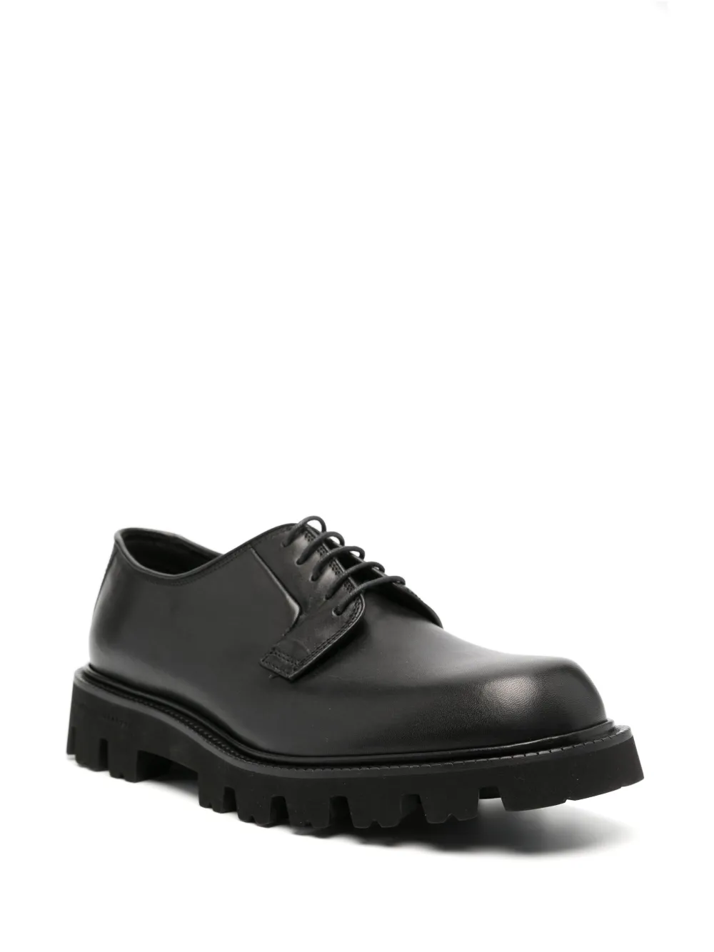 Черный, телячья кожа, гладкая текстура кожи, глянцевая фактура, металлический логотип, закругленный носок, шнуровка спереди, кожаная стелька с логотипом, низкий блочный каблук и рифленая резиновая подошва.