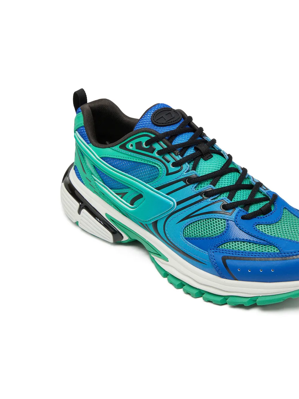 Сине-зеленый, синий, вставки, сетчатые вставки, нашивка с логотипом сбоку, нашивка с логотипом на язычке, петля для подтягивания сзади, закругленный носок, шнуровка спереди, стелька с логотипом и массивная резиновая подошва.