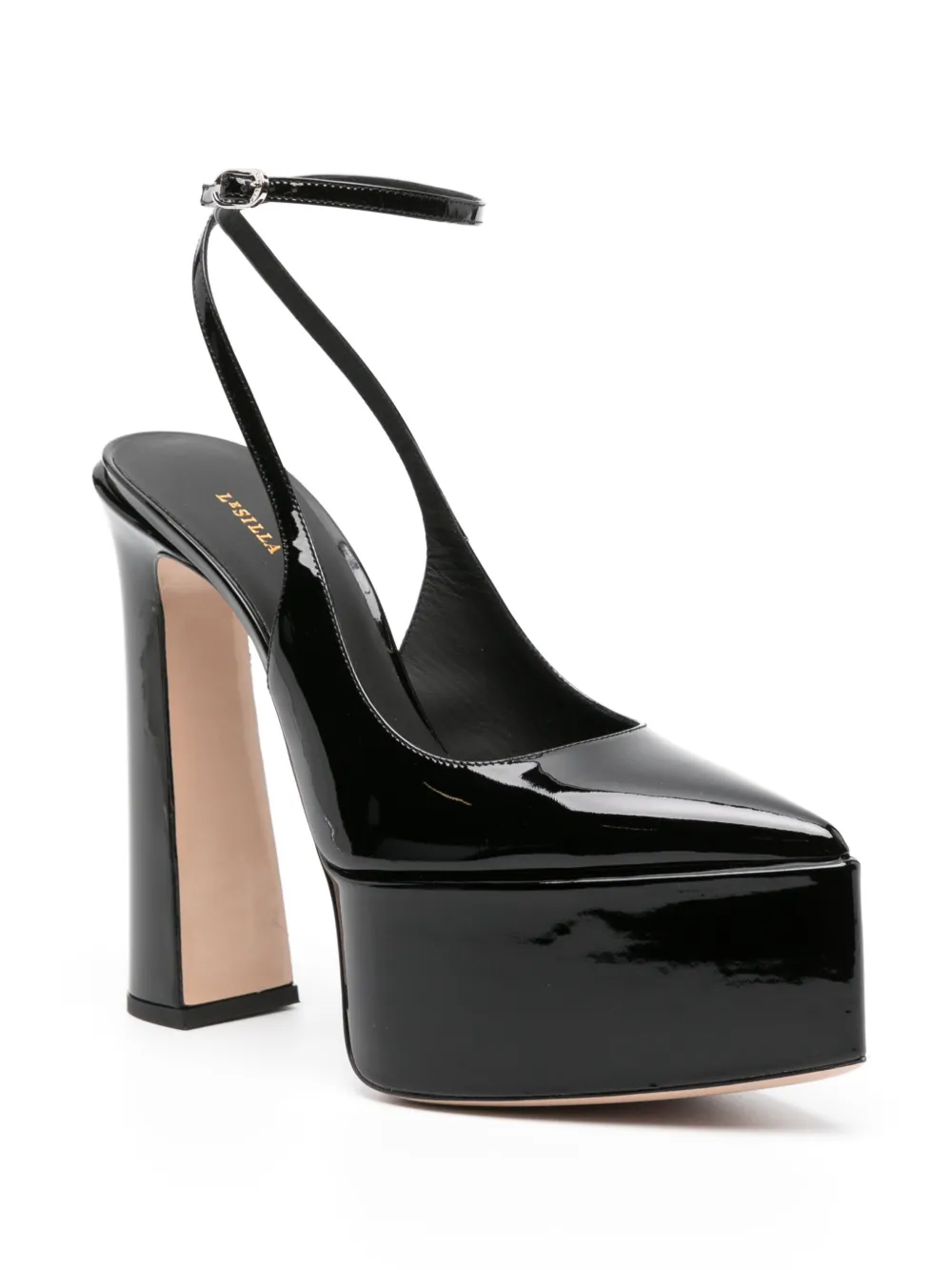 Черный, телячья кожа, лакированная отделка, заостренный носок, ремешок на пятке с пряжкой, высокий каблук, кожаная стелька с логотипом и подошва на платформе.
