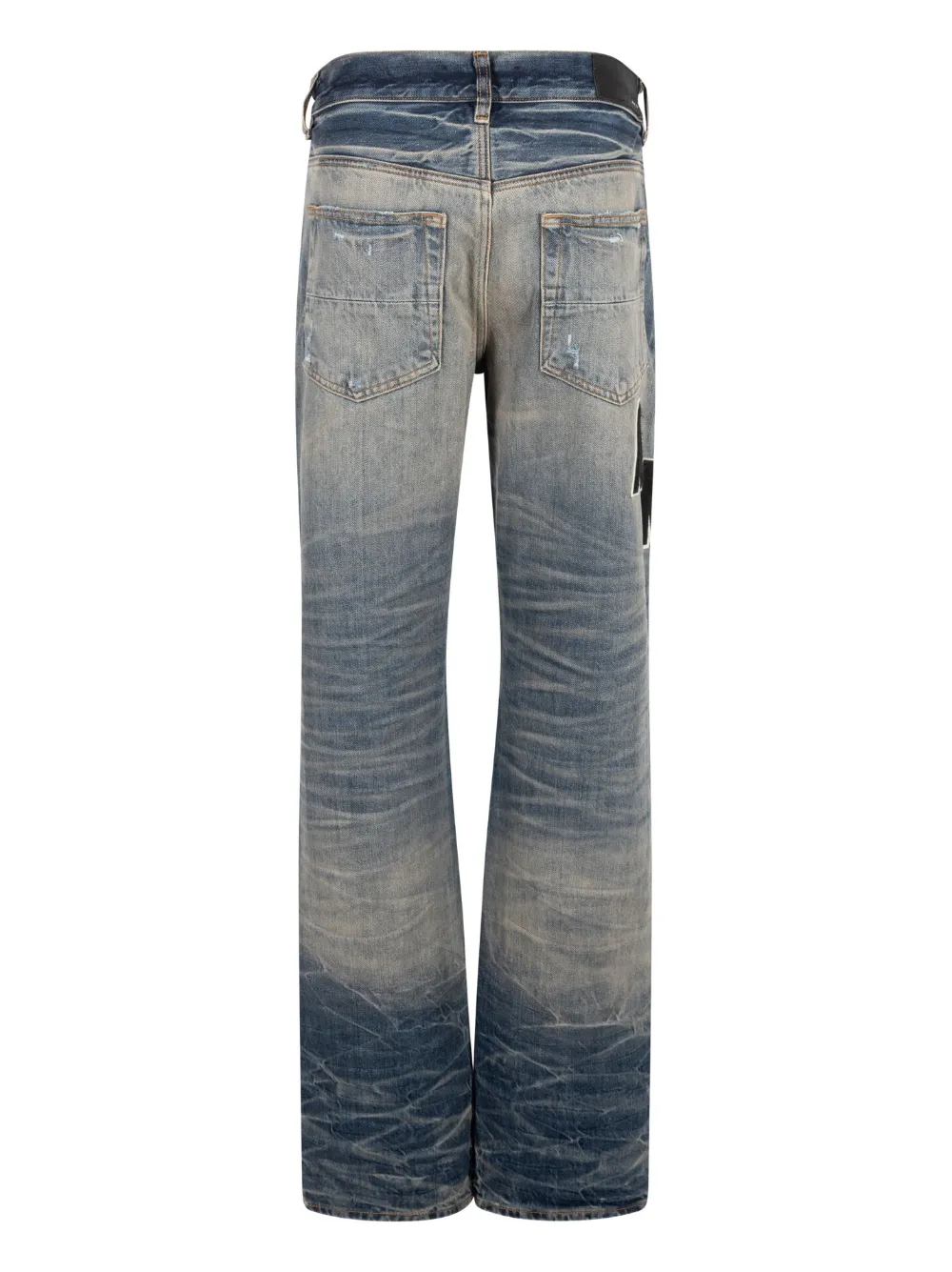 Пудрово-голубой, хлопок, деним, эффект потертости, эффект потертости, нашивка с логотипом спереди, средняя посадка, петли для ремня, потайная застежка на молнии и пуговицах, пять карманов и прямой крой.