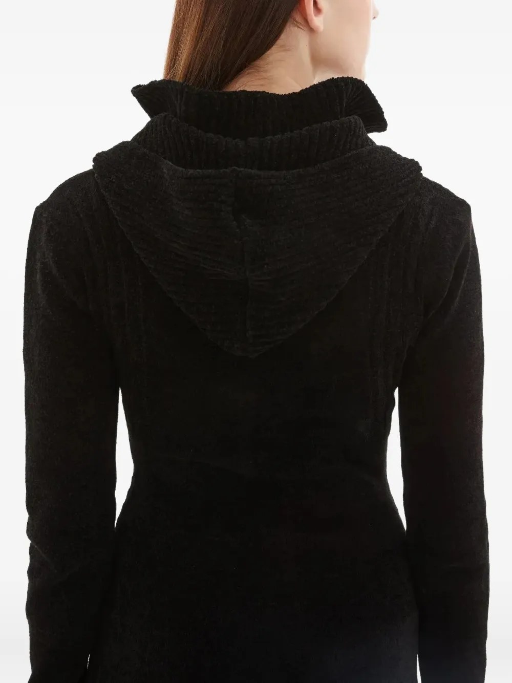 Черный капюшон, застежка-молния спереди, завязки, манжеты с отверстием для большого пальца, рубчатая текстура