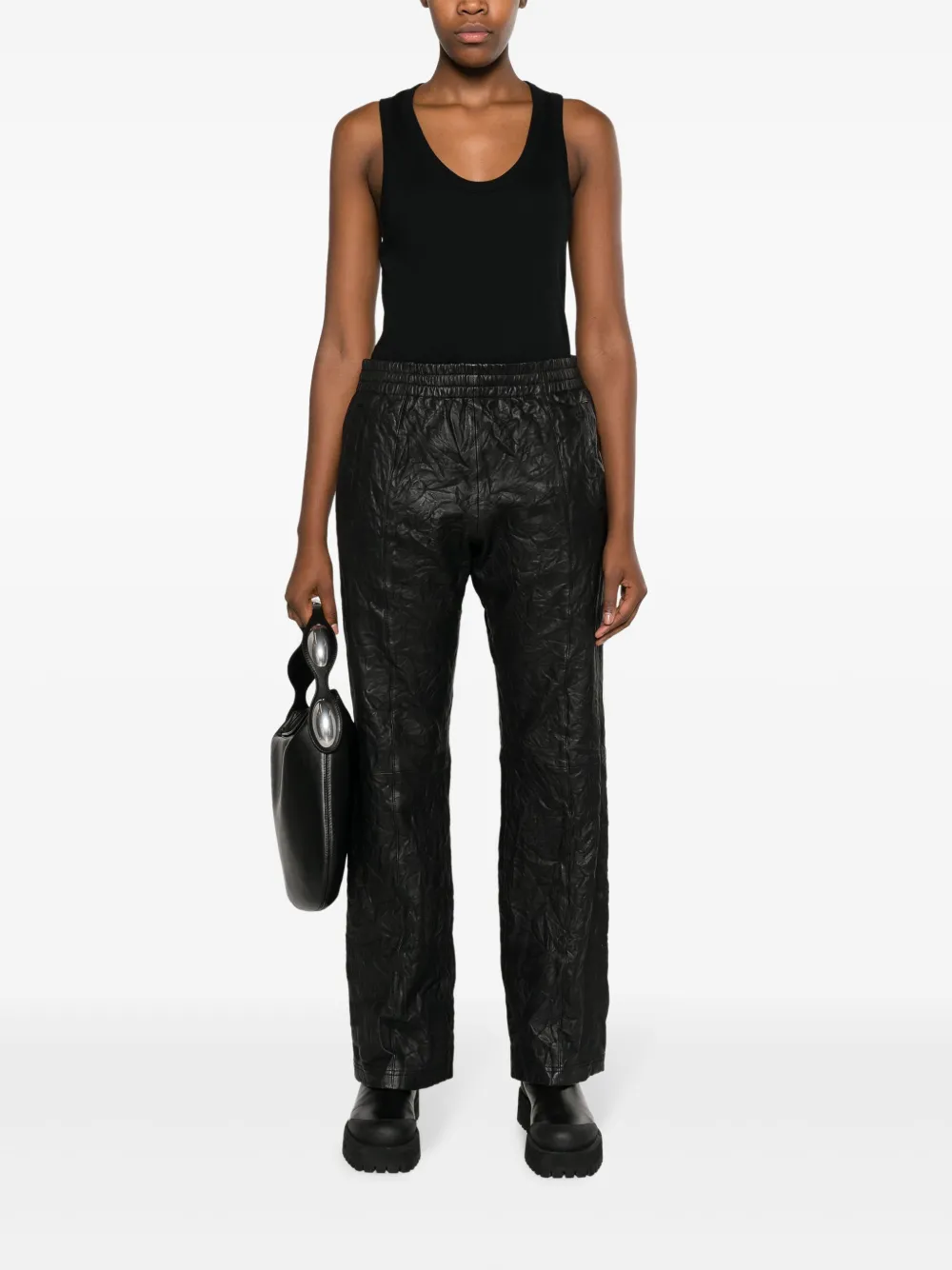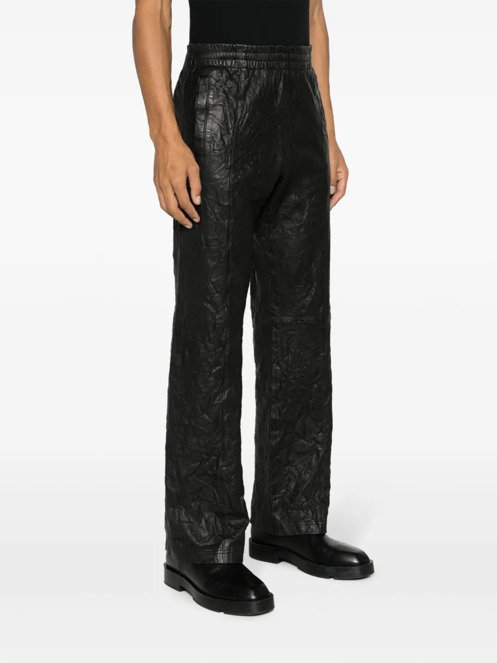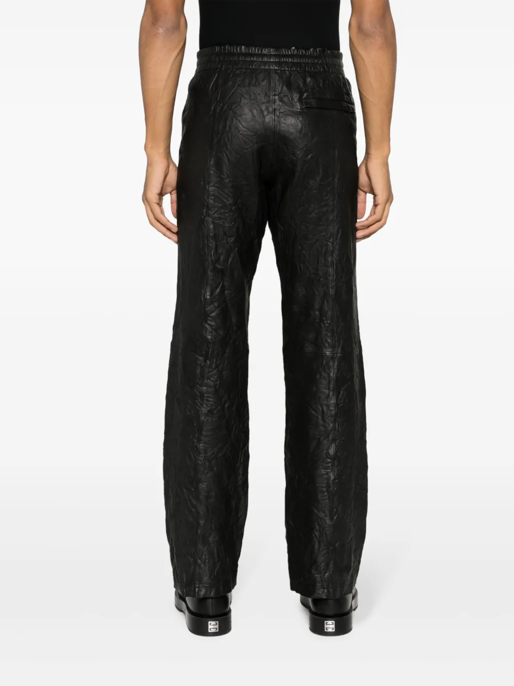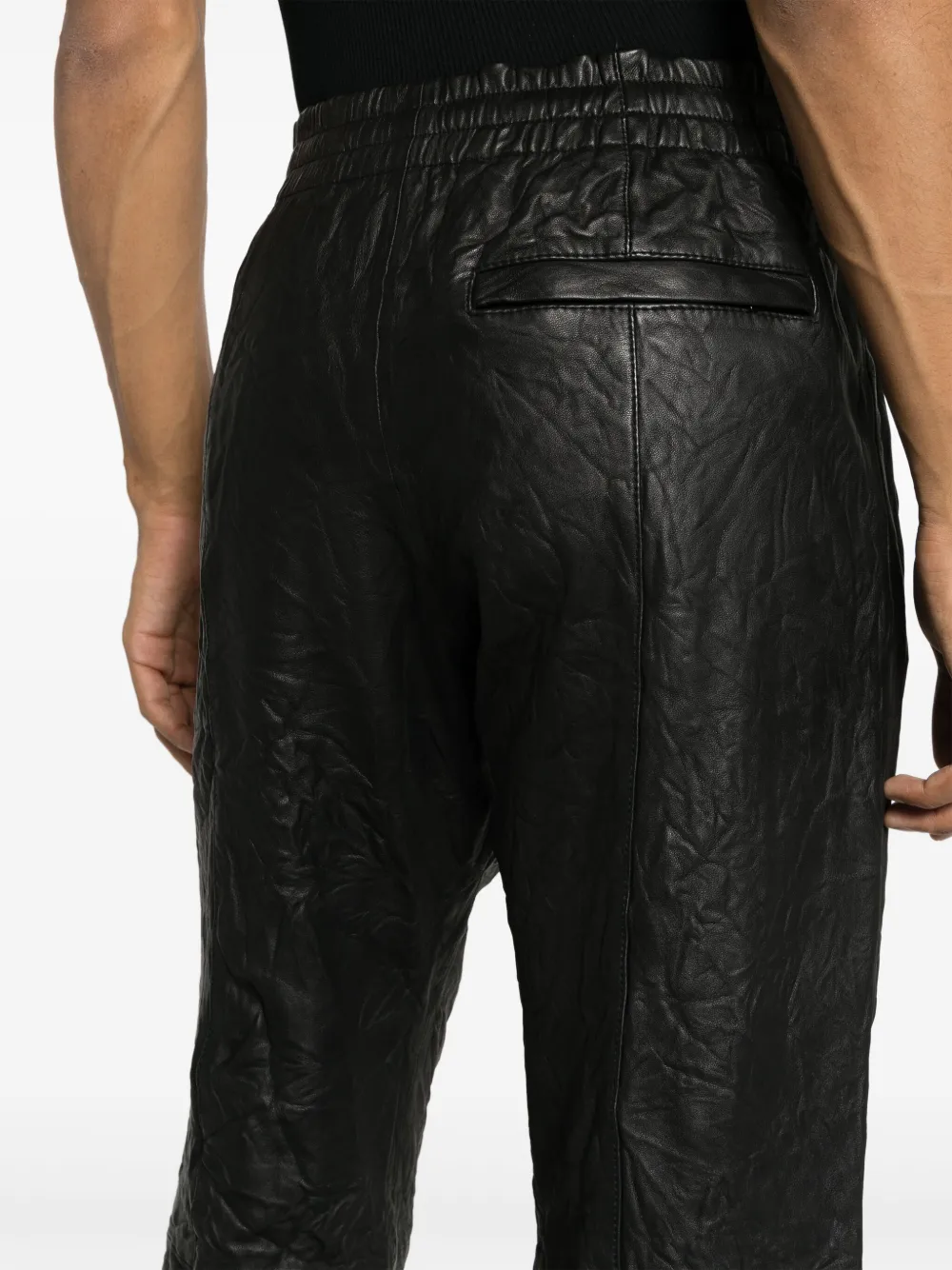 Черный, овечья кожа, жатый эффект, средняя посадка, прямой крой, эластичный пояс, прорезной карман сбоку и задние карманы с листочкой. Это унисекс-модель. Обратите внимание, что для нее используется мужская размерная сетка.