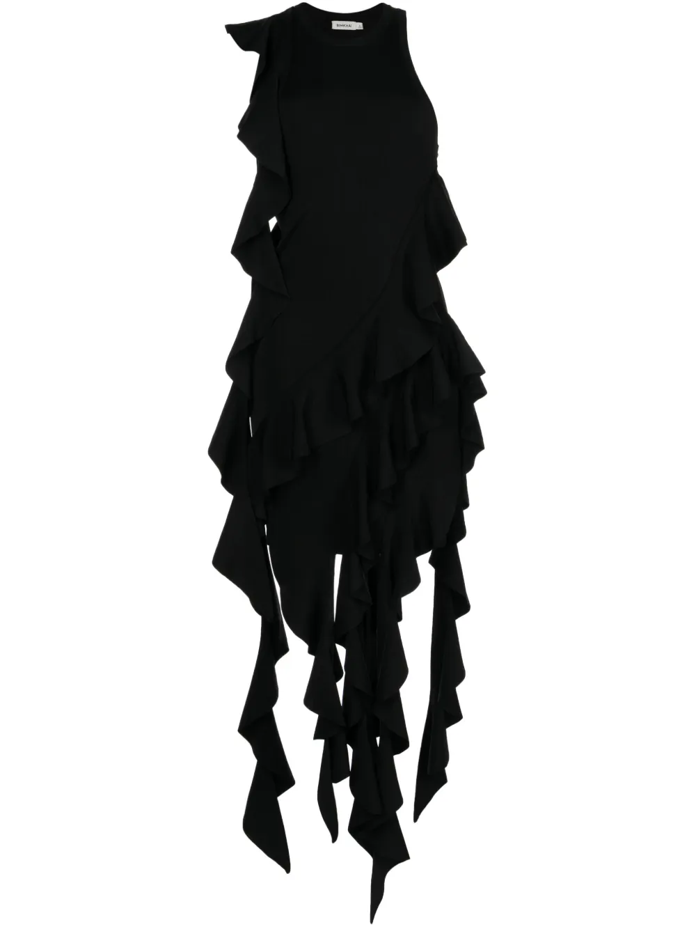 Черный, асимметричная форма, вставки с оборками, круглый вырез, приталенный силуэт, широкие бретели, без рукавов, ярусная юбка и асимметричный подол.