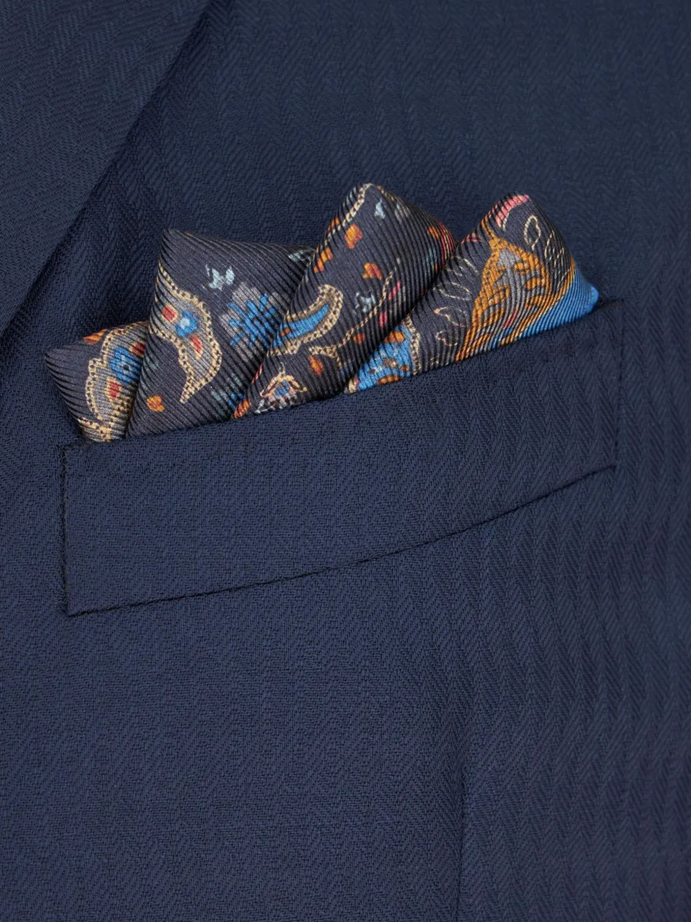Кобальтово-синий, разноцветный, шелк, контрастные края, принт пейсли, цветочный принт, логотип спереди, квадратная форма, несколько оборотов и обработанные края.