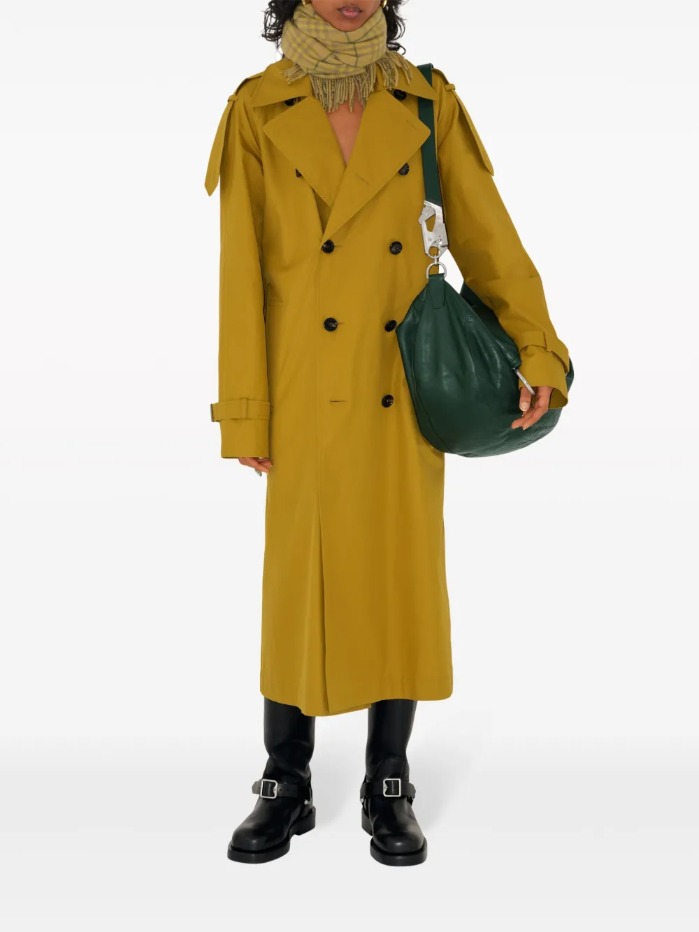 Песочно-бежевый, хлопок, саржевое переплетение, широкие зазубренные лацканы, длинные рукава, манжеты с ремешками, двубортная застежка на кнопки, ремень на талии, два вшитых кармана по бокам, подкладка в клетку и прямой подол.