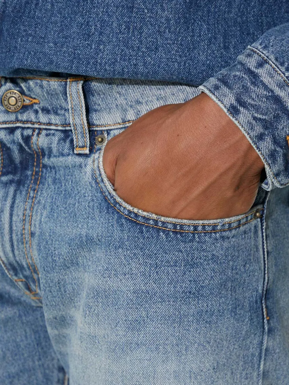 Синий эффект потертости детали с необработанным краем дизайн с пятью карманами застежка на пуговицу и молнию