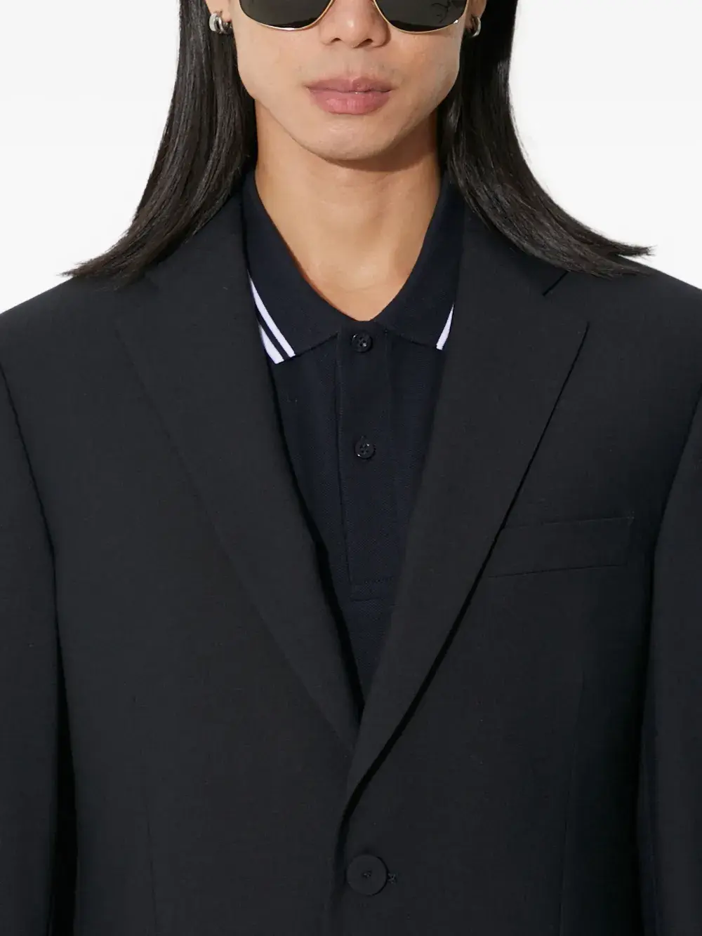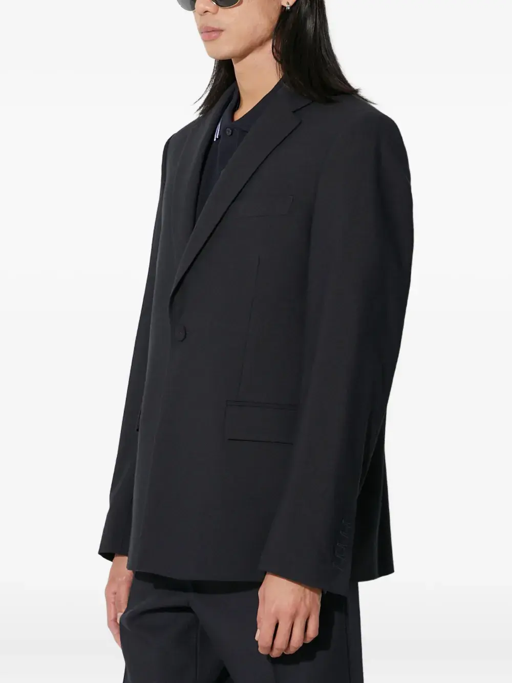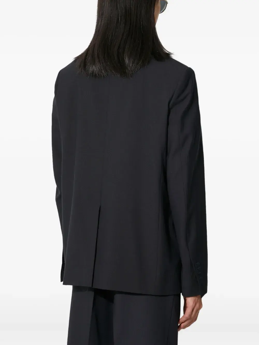 Темно-синий, застежка на одну пуговицу, лацканы с вырезом, прорезные карманы, прямой подол, структурированные плечи