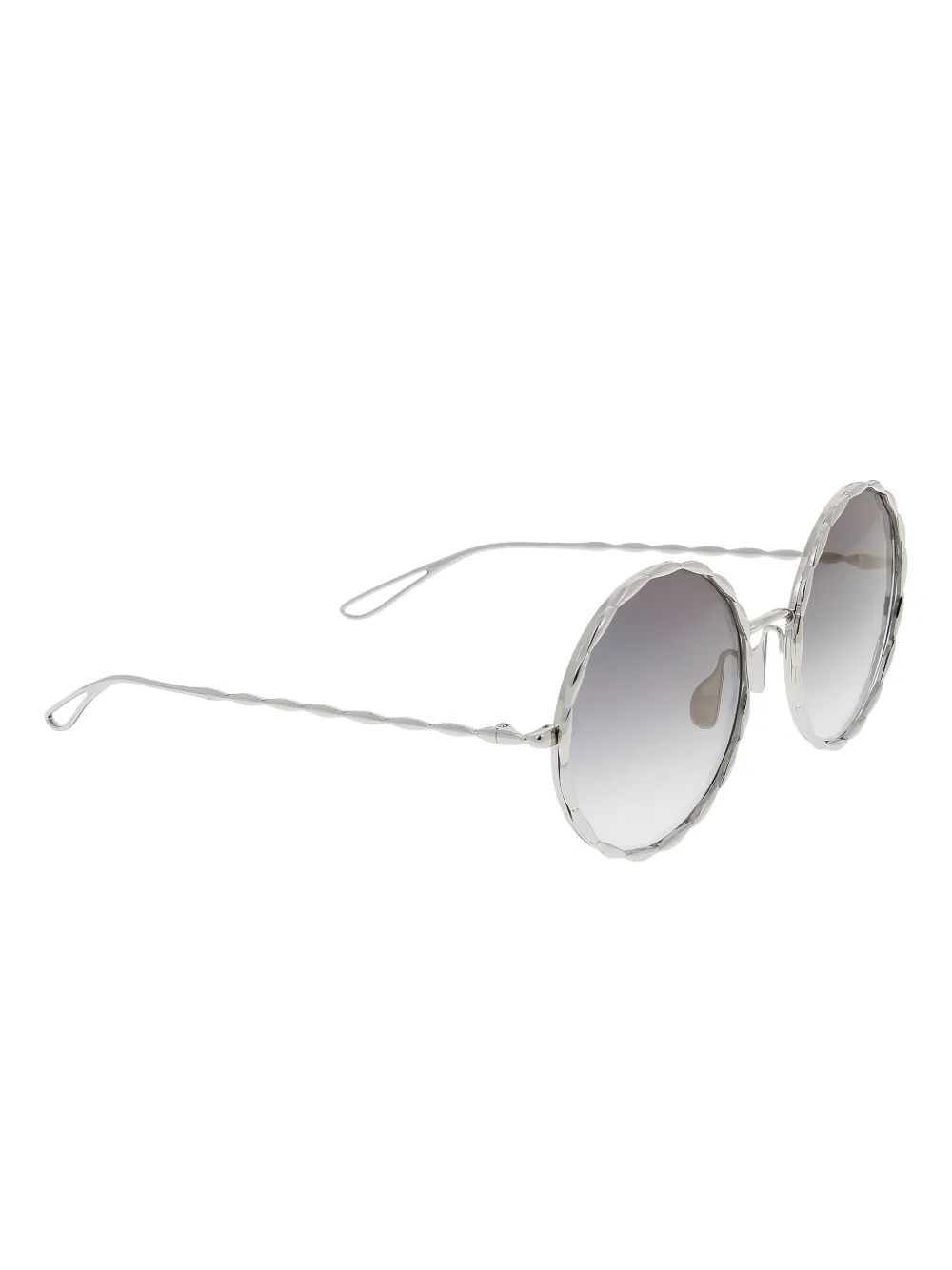 Серебристая оправа круглой формы, носовые упоры, текстурированные детали, зеркальные линзы. В комплекте идет защитный футляр.