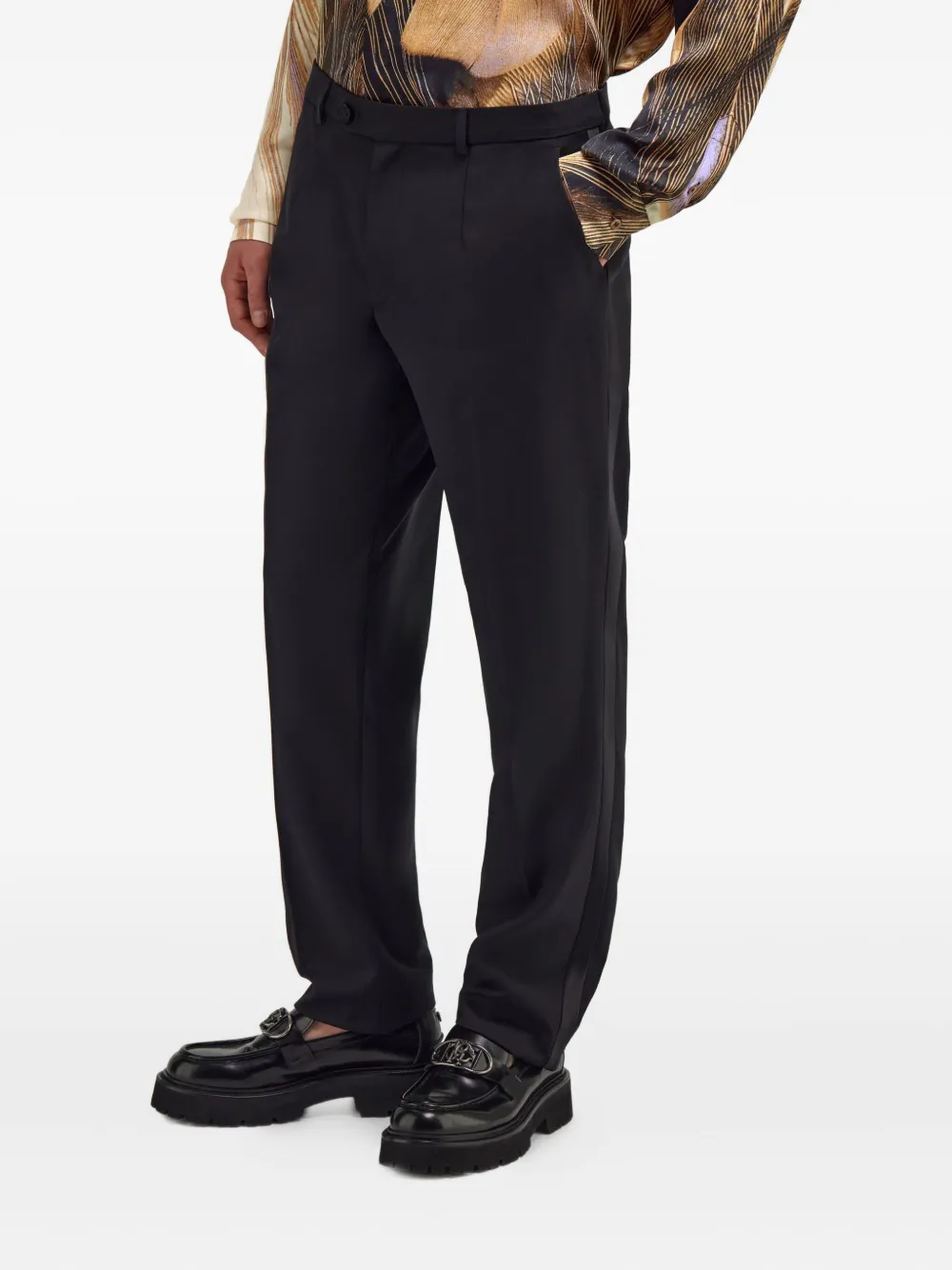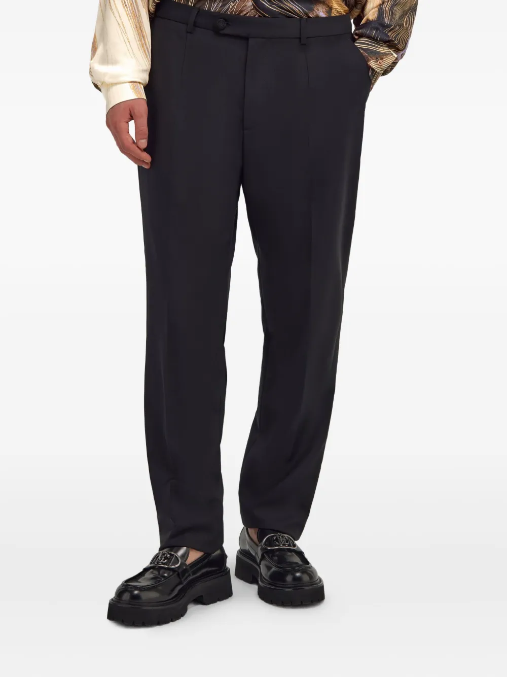 Черные прямые брюки со складками спереди, средней посадкой, застежкой на пуговицу и боковыми карманами