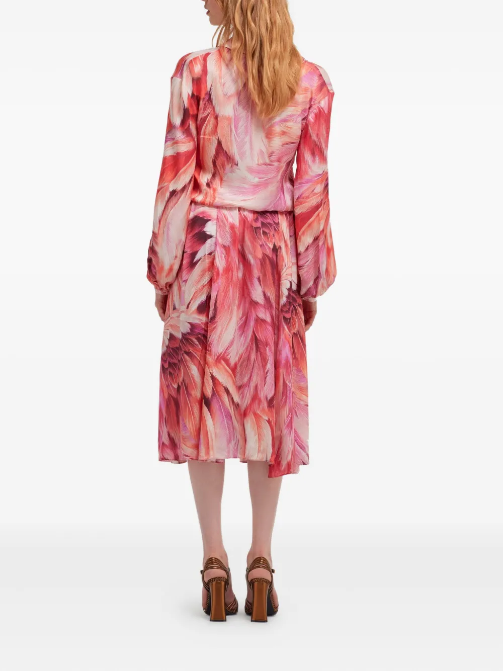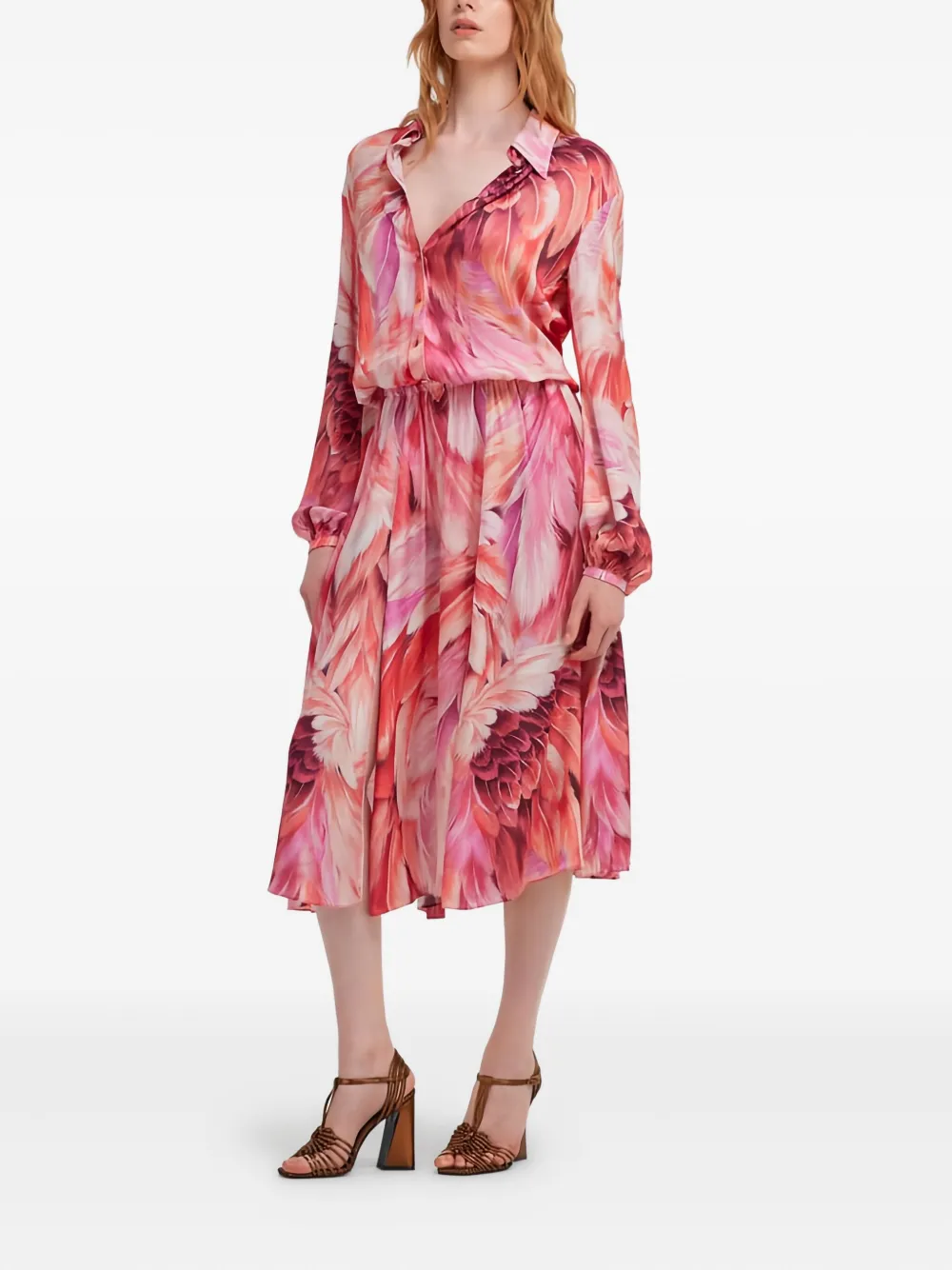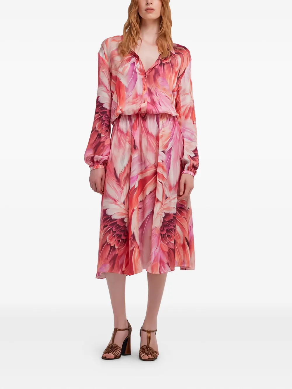Розовое платье с принтом из перьев, застежкой на пуговицы, длинными рукавами, приталенной талией и юбкой силуэта "А-силуэт"