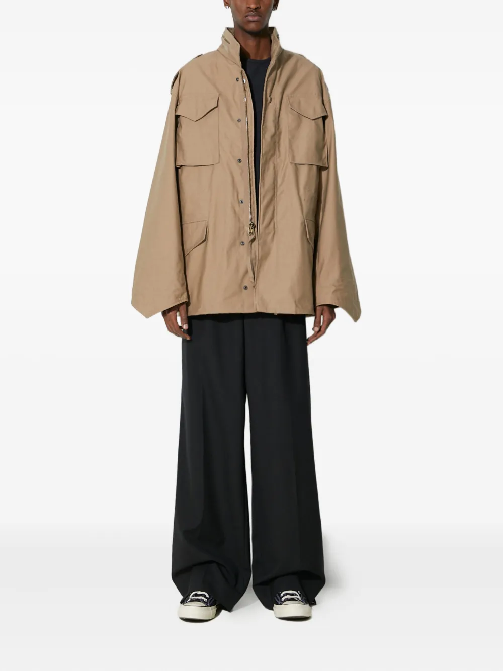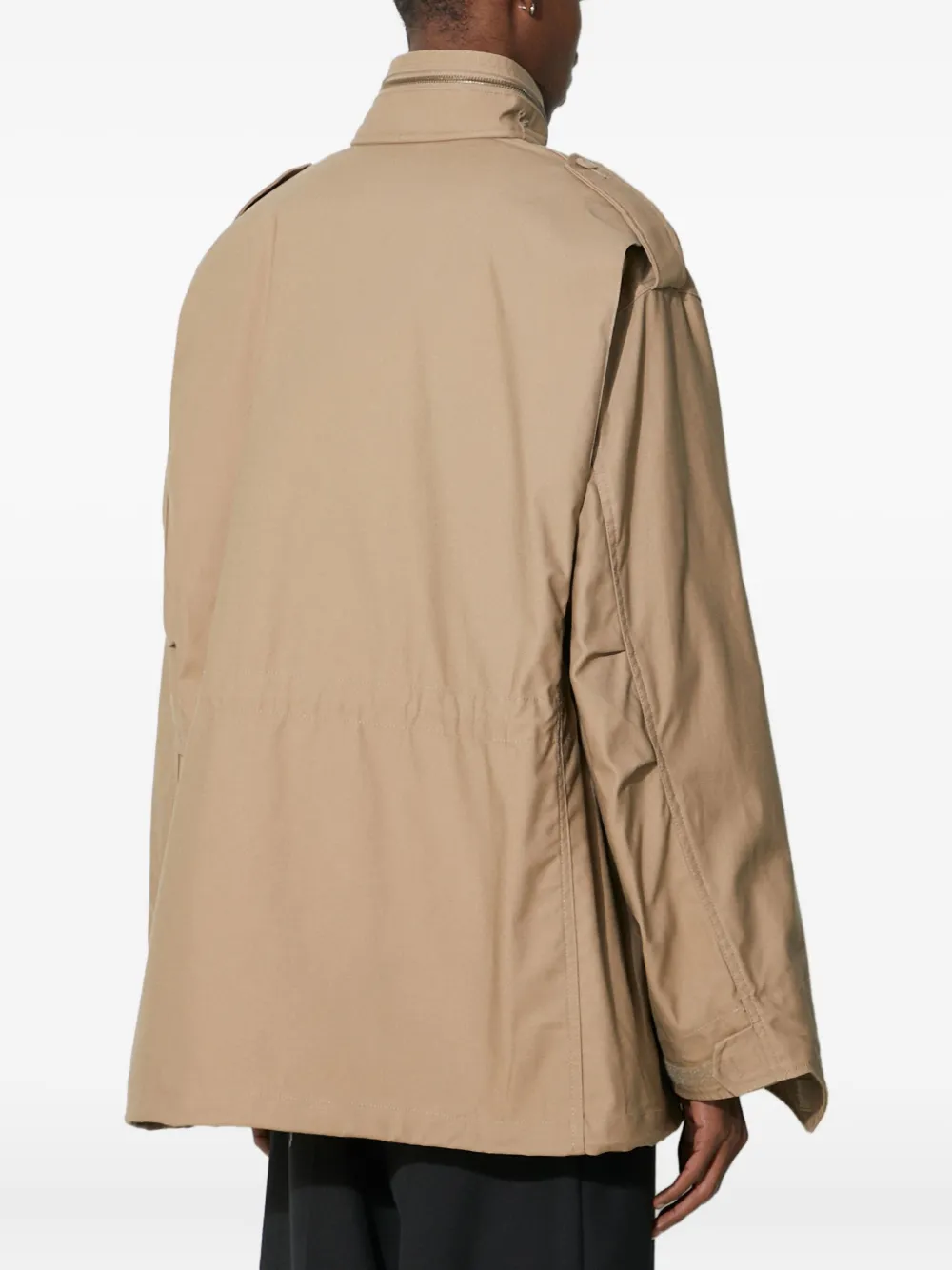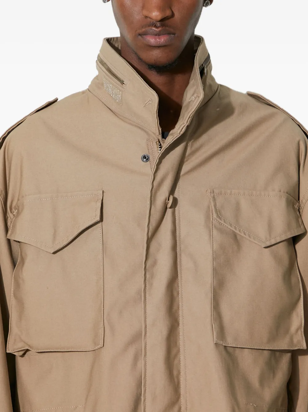 Бежевый, четыре накладных кармана с клапанами, застежка-молния, планка на пуговицах, высокий воротник, погоны