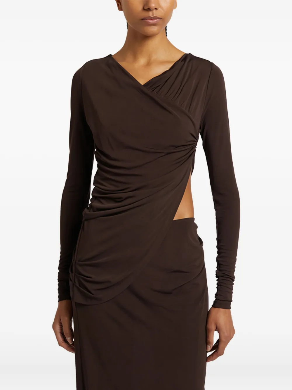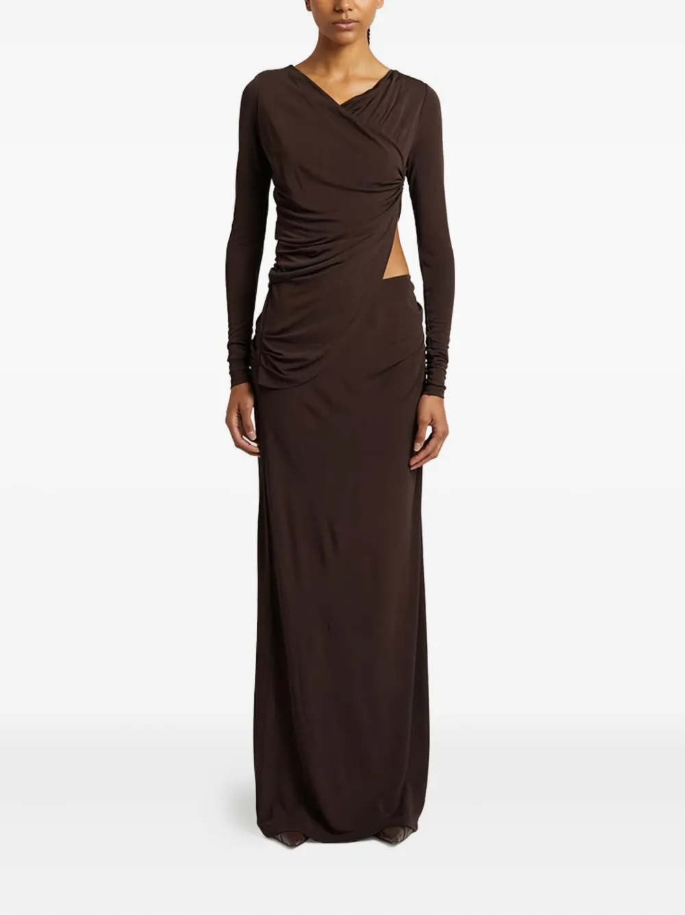 Коричневое платье макси с драпировкой, вырезами по бокам, длинными рукавами и сборкой на лифе