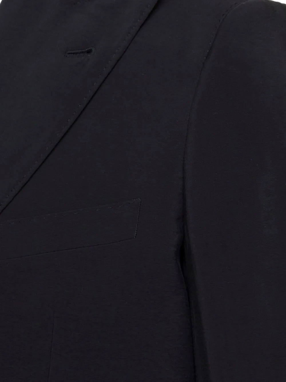 Черный однобортный пиджак с застежкой на три пуговицы, лацканами с вырезом, клапанами на карманах и подкладкой с леопардовым принтом