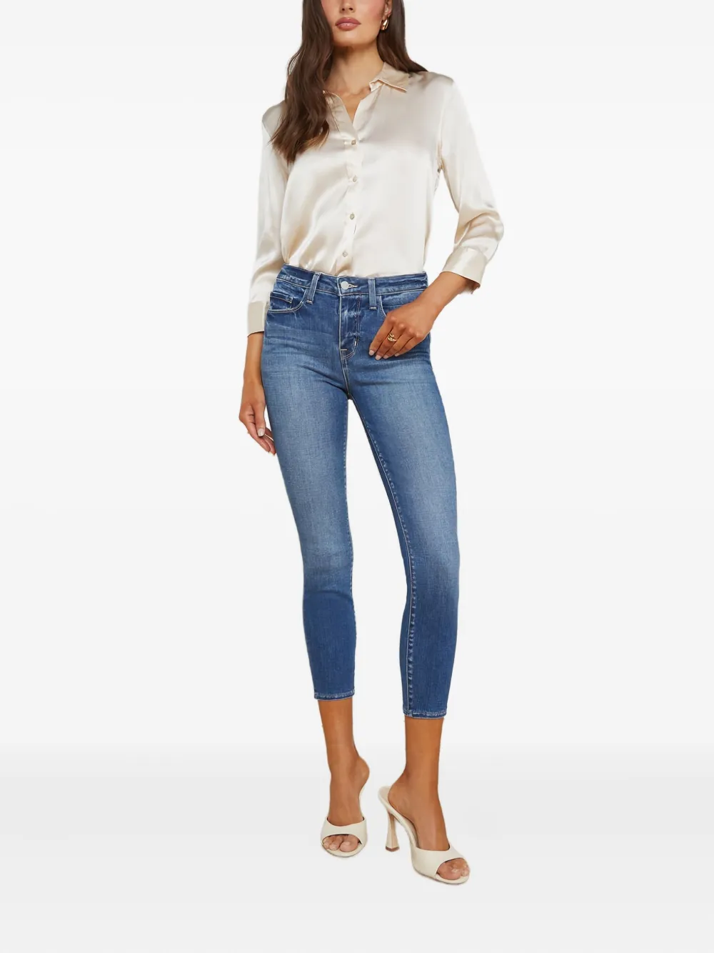 Голубые джинсы с высокой талией, застежкой на пуговицы и пятью карманами