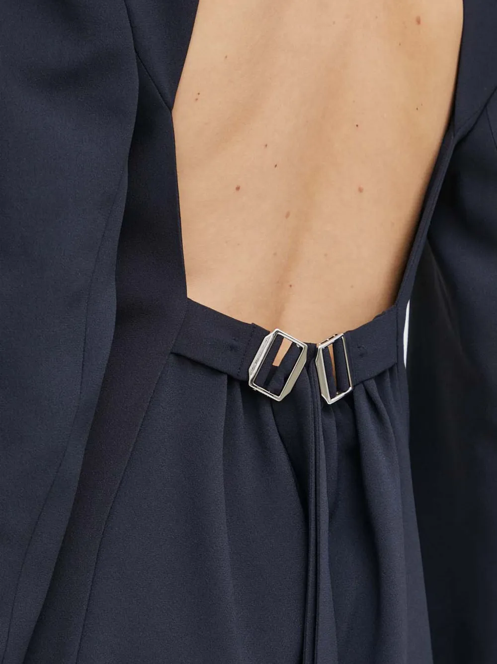 Темно-синий цвет, открытая спина, застежка на пуговицу, подплечники, длинные рукава