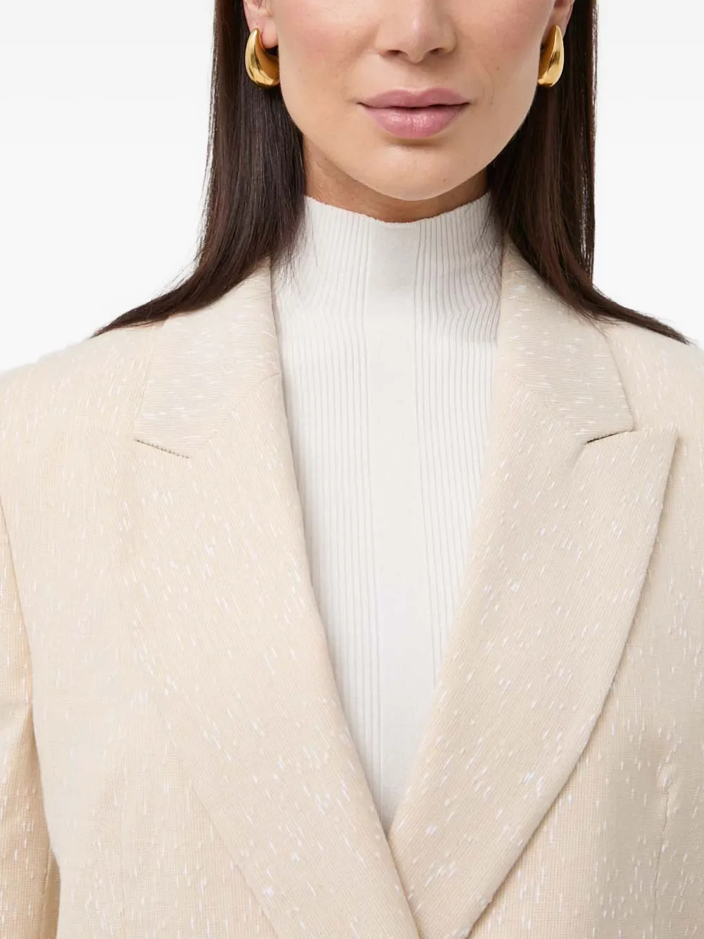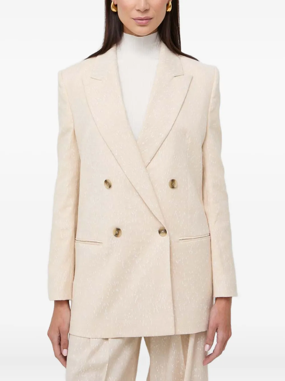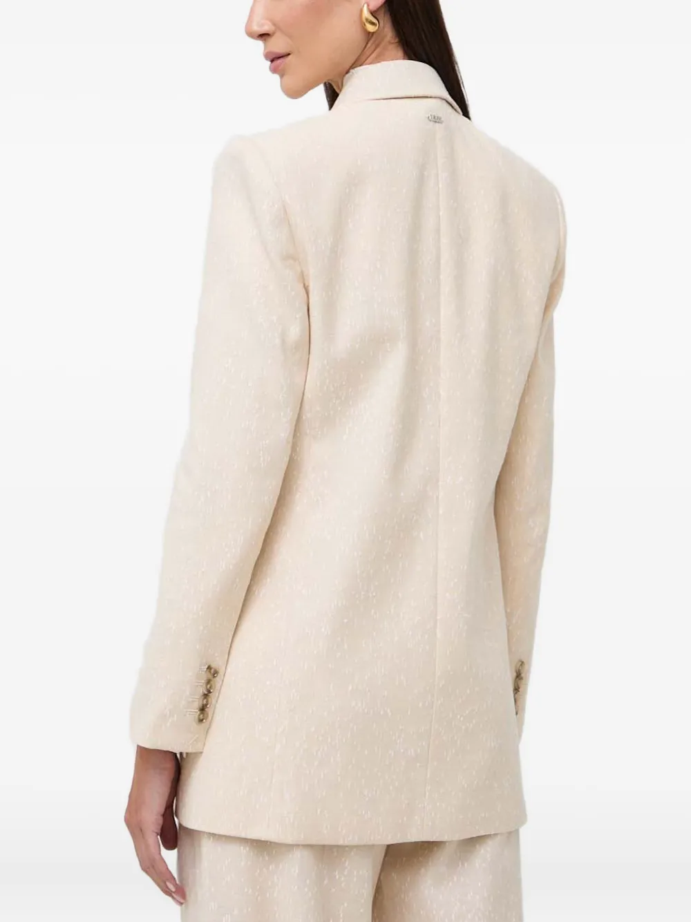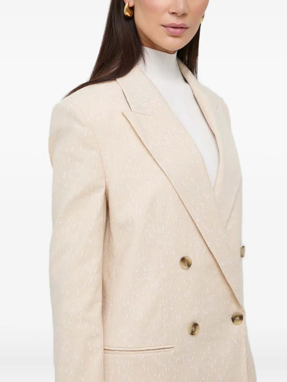 Бежевый цвет, двубортная застежка, пятнистый рисунок, лацканы с вырезом, длинные рукава, прорезные карманы