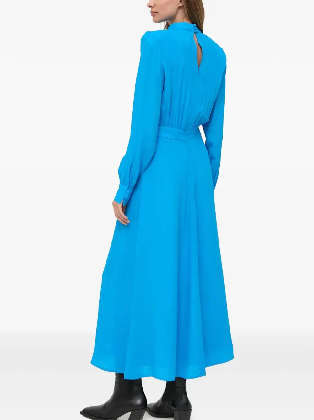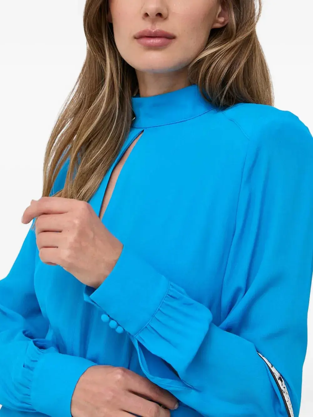 Ярко-синий высокий воротник деталь в виде выреза-капельки длинные рукава присборенная талия