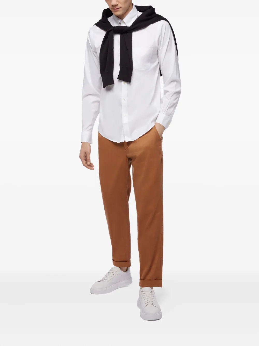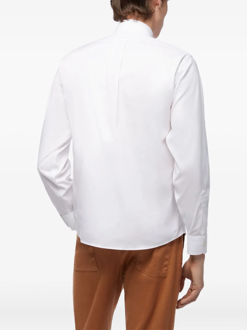 Белая рубашка с отложным воротником на пуговицах, нагрудным карманом, застежкой на пуговицы, длинными рукавами и манжетами на пуговицах