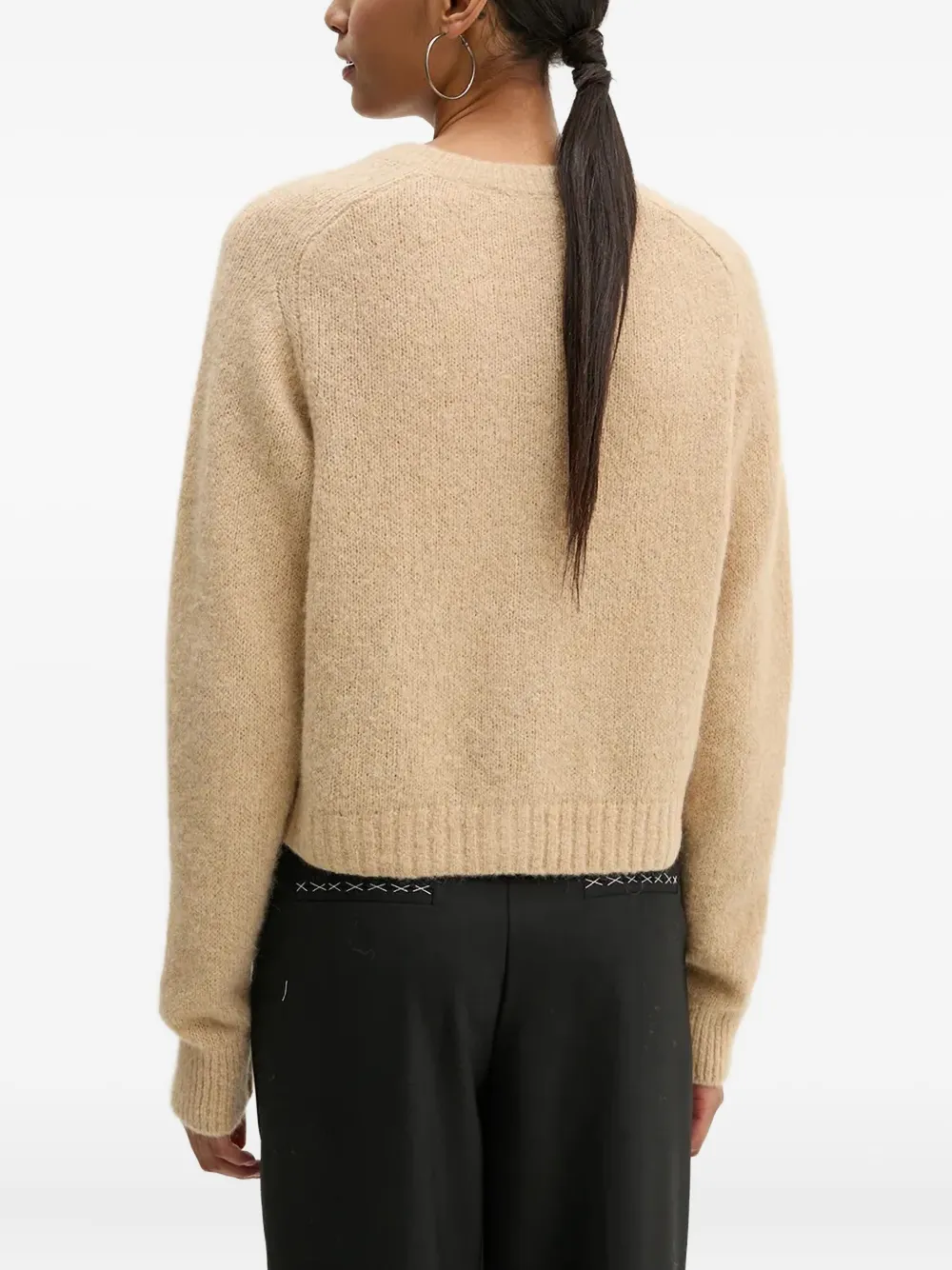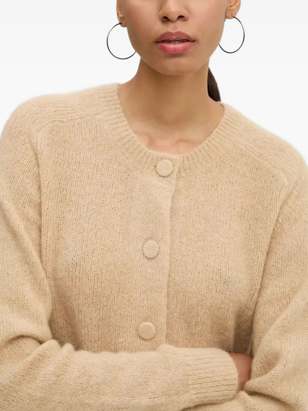 Бежевый, застежка на пуговицы спереди, круглый вырез, длинные рукава, ребристый низ