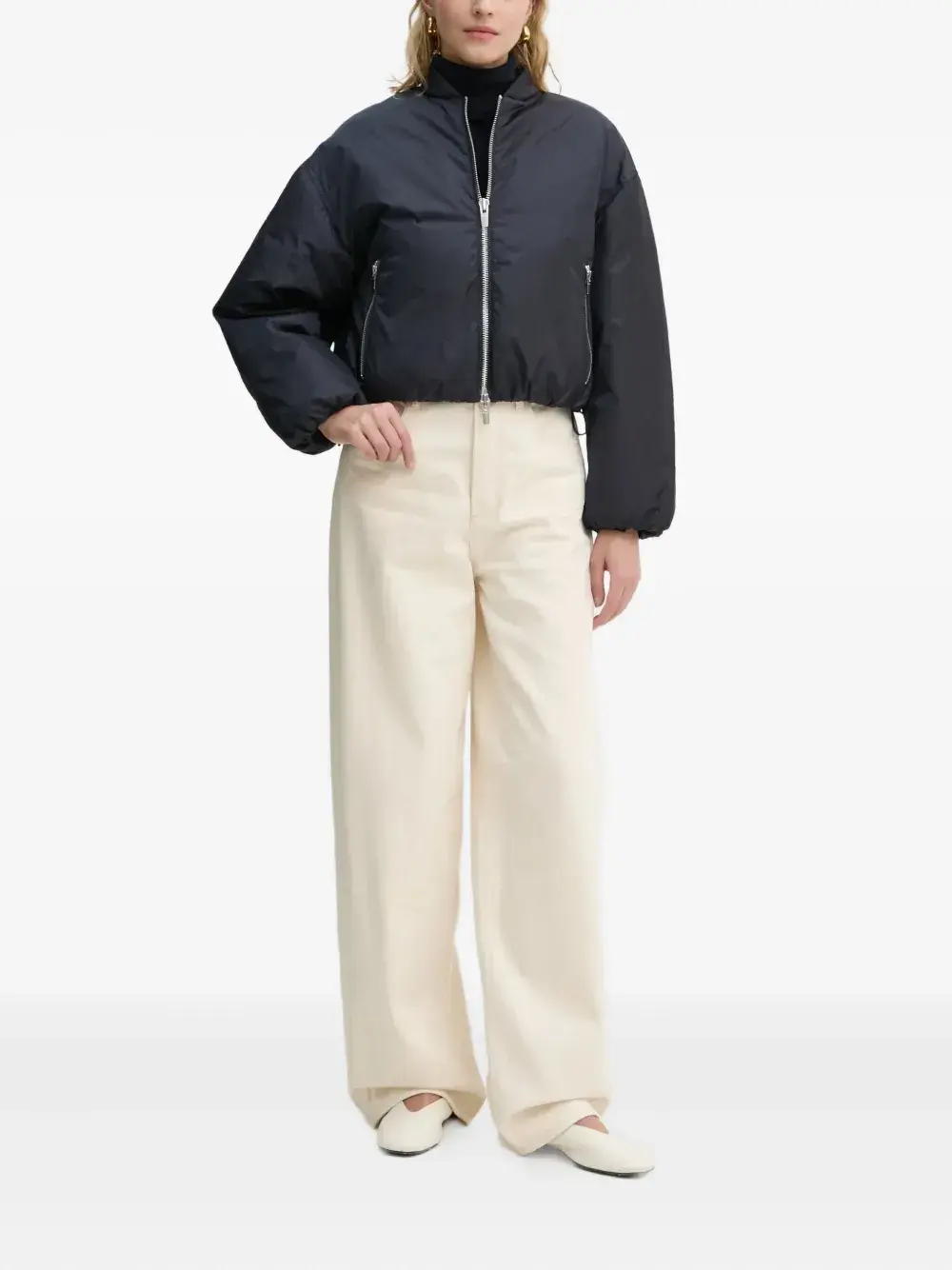 Темно-синий цвет, застежка-молния, длинные рукава, кулиска по низу, боковые карманы на молнии
