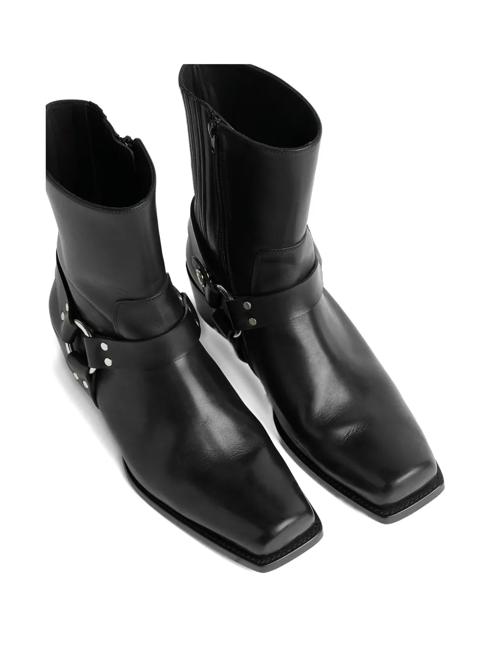 Черные ботильоны с деталями в виде ремней, фурнитурой серебристого цвета, боковой молнией и устойчивым каблуком