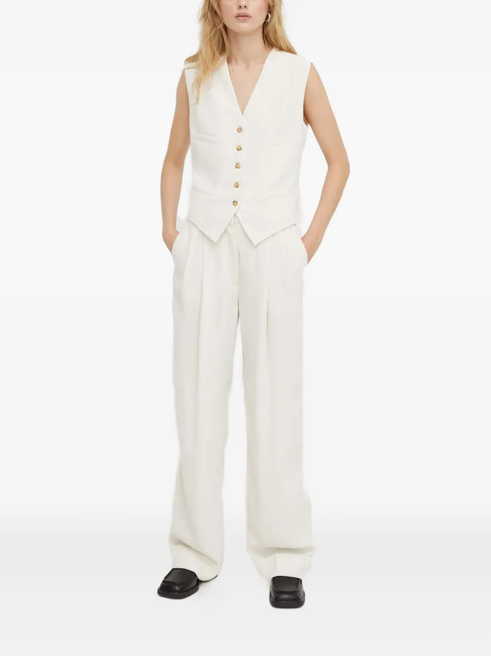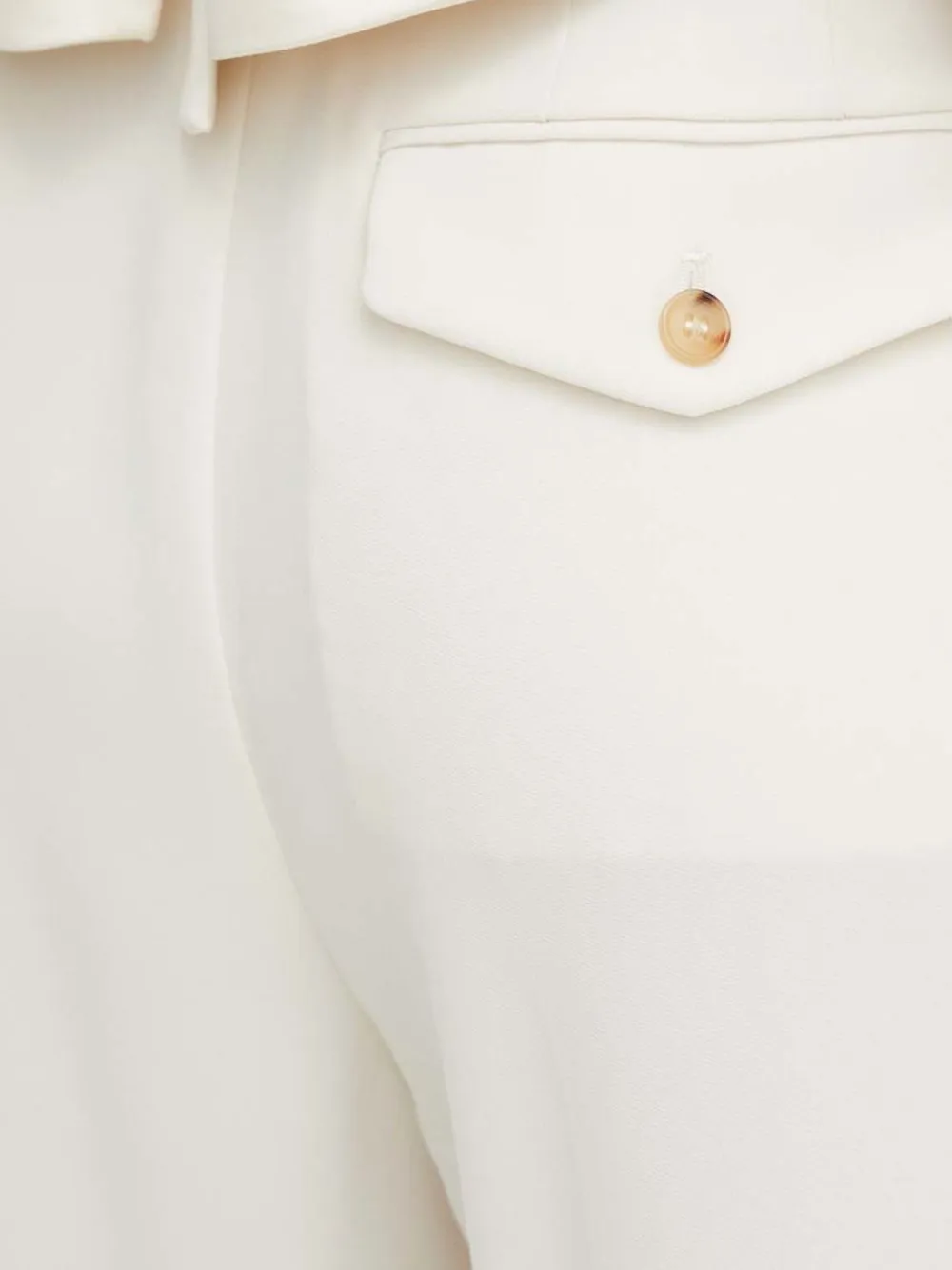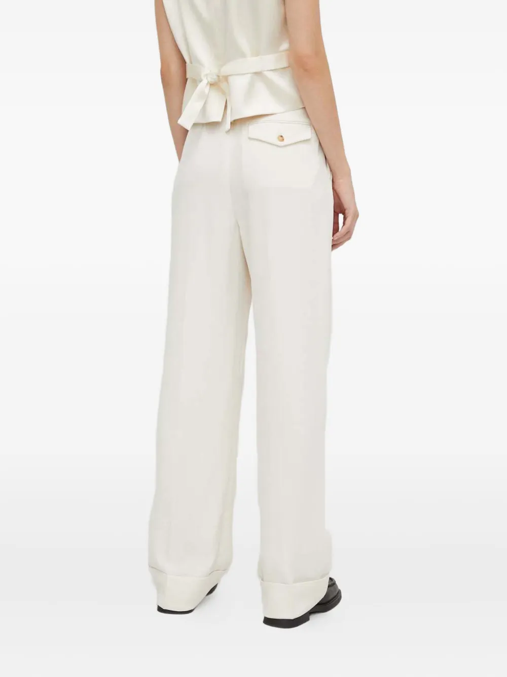 Белые брюки с задним клапаном на кармане, застежкой на пуговицу, защипами спереди и манжетами по краю