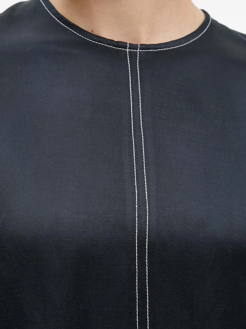 Черный топ с контрастной строчкой, круглым вырезом, длинными рукавами и прямым подолом