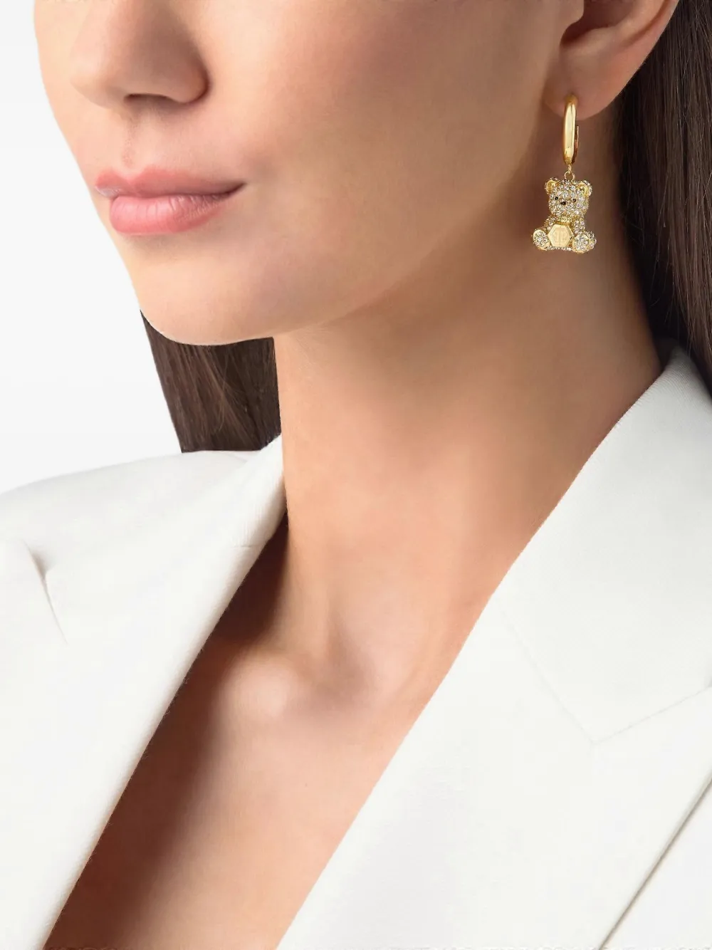 Золотые серьги-кольца с украшением в виде кристального медвежонка. Эти серьги идут в паре. Обычное повседневное использование и воздействие внешних факторов могут уменьшить блеск драгоценных камней и золотых поверхностей. Для ухода используйте специальные неабразивные средства, предназначенные для чистки ювелирных изделий.