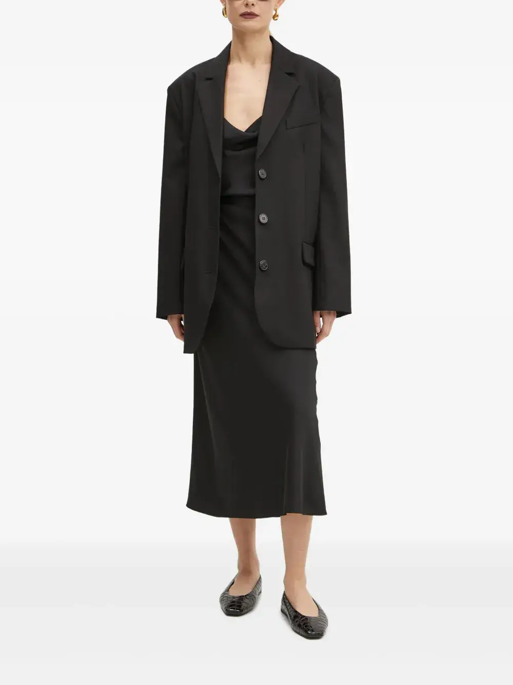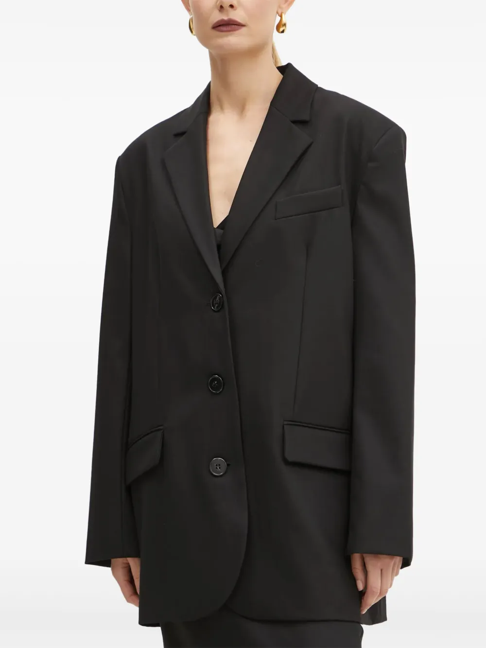Черные подплечники, застежка на пуговицы, лацканы с острым отворотом, длинные рукава, прямой низ