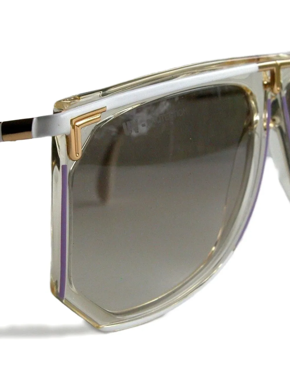 Белая геометрическая оправа, фурнитура золотистого цвета, носоупоры, тонированные линзы, тонкие дужки. В комплекте идет защитный чехол.