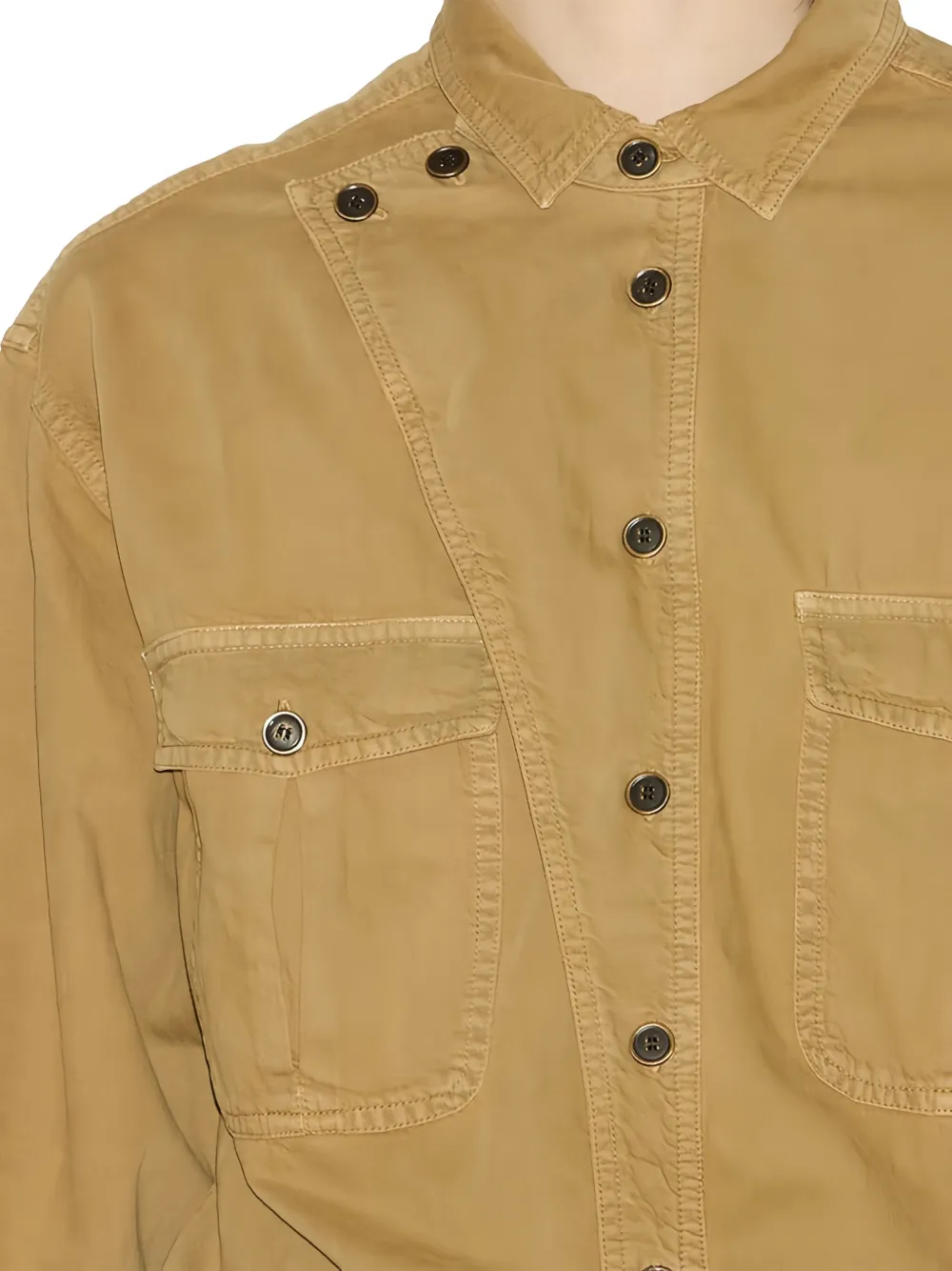 Светло-коричневый, застежка на пуговицы, нагрудные карманы, пояс на кулиске, длинные рукава, манжеты на пуговицах