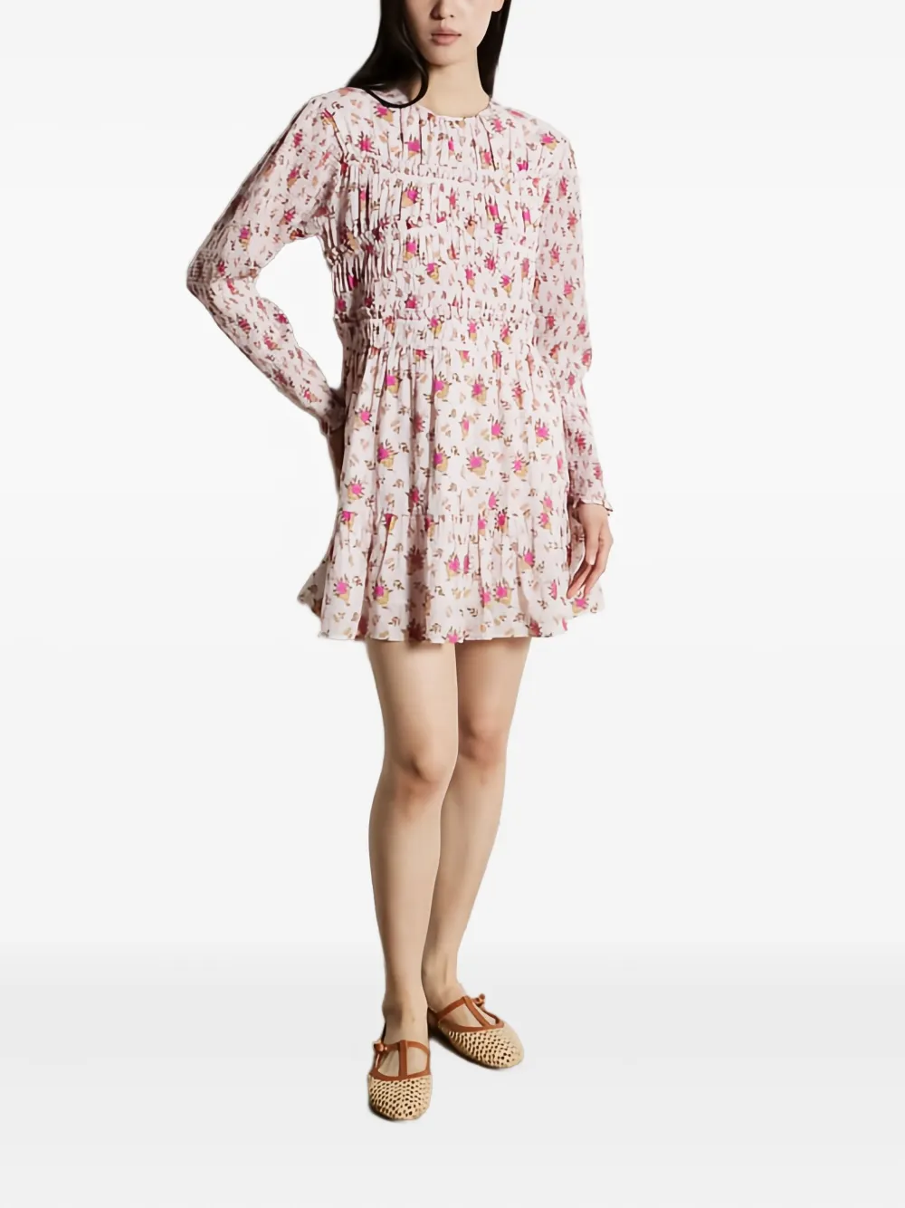 Розовое платье с цветочным принтом, присборенным лифом, длинными рукавами, многоярусной юбкой и круглым вырезом