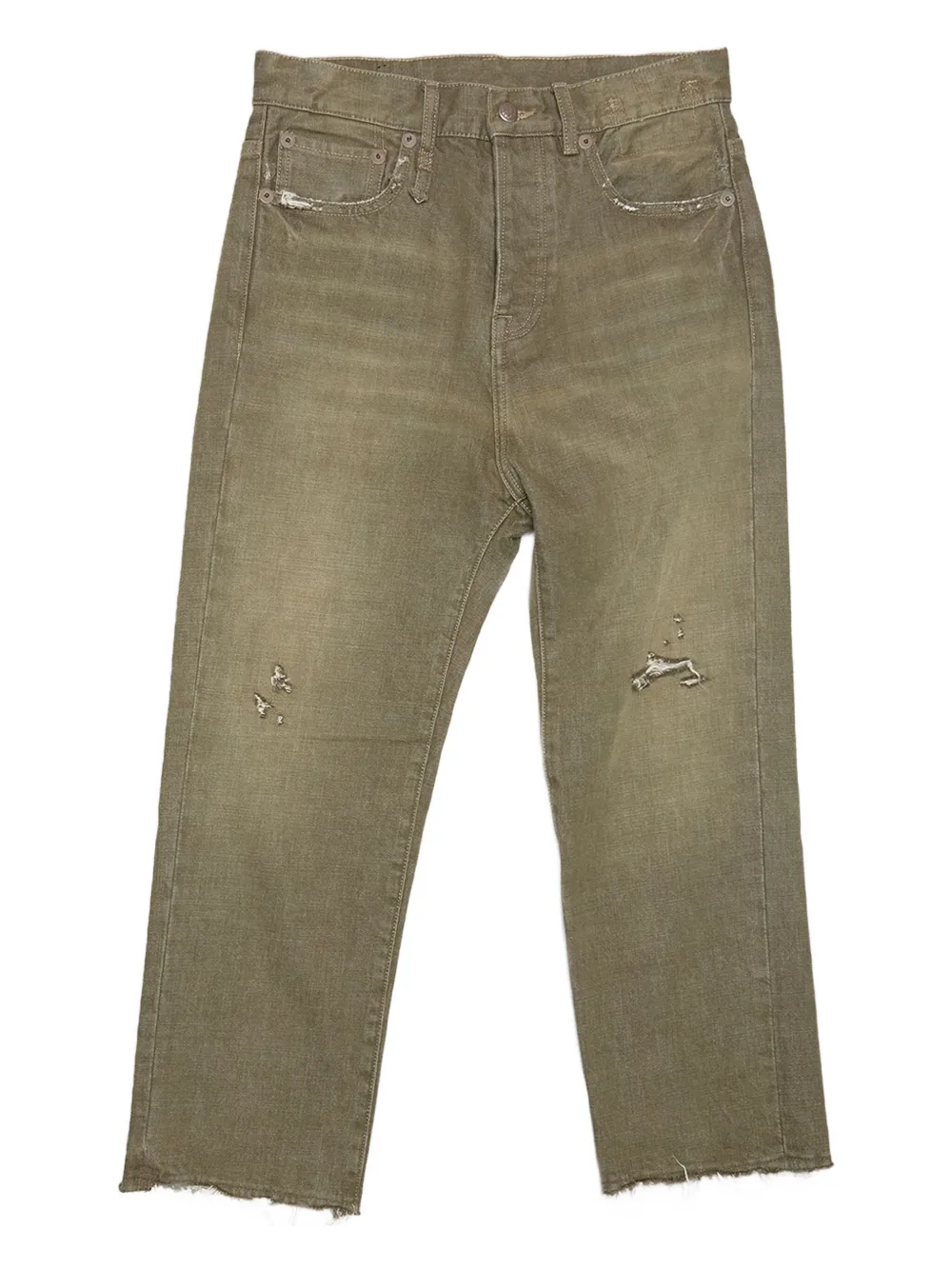 Оливково-зеленый цвет, потертости, необработанный край, застежка на пуговицы, пять карманов, тональная строчка