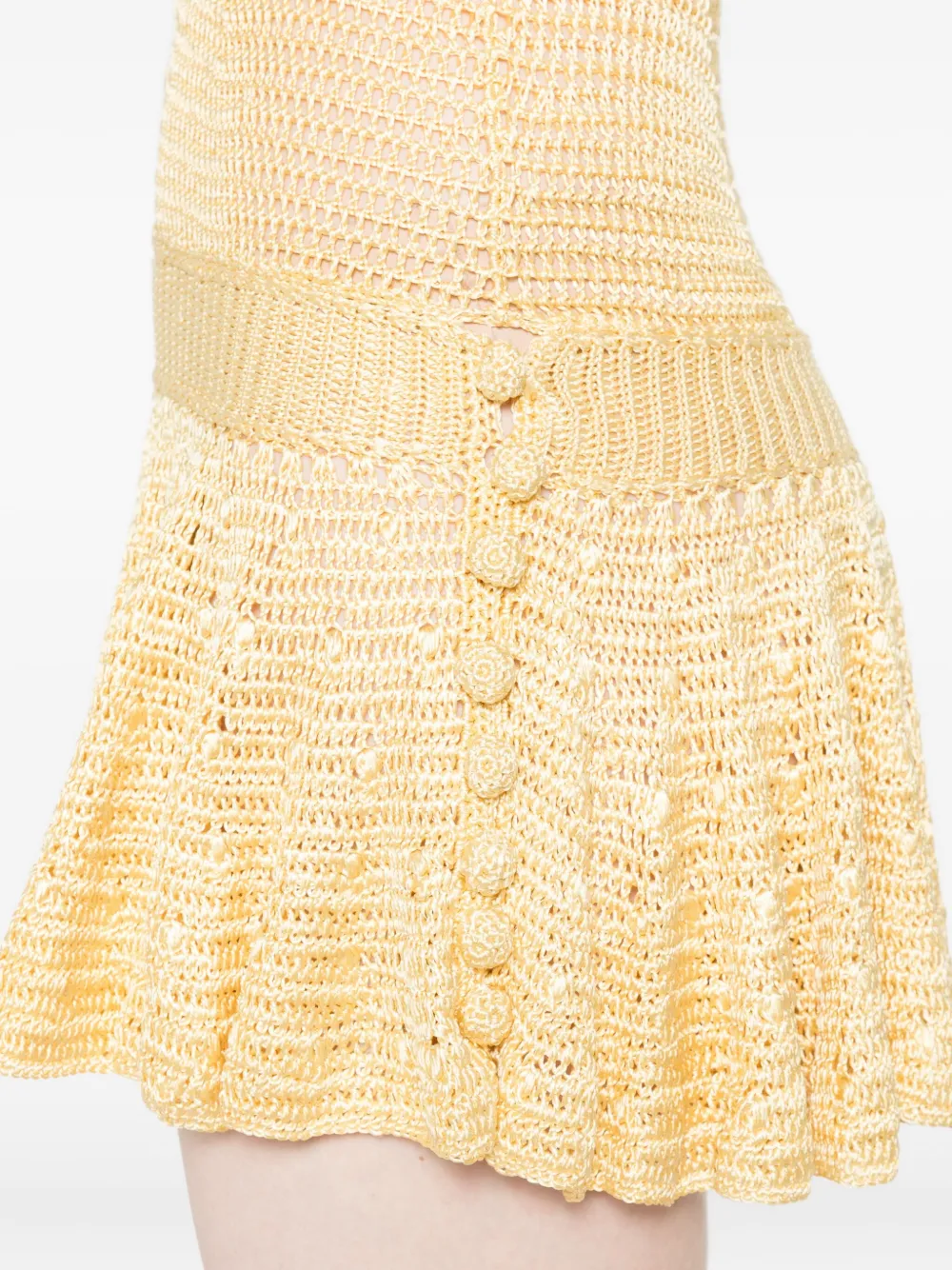 Бледно-желтый вязаный крючком вырез "плечи открыты" оборчатый подол декор пуговицами приталенный лиф