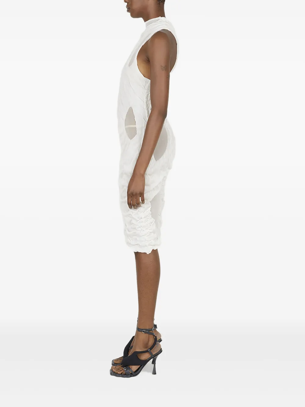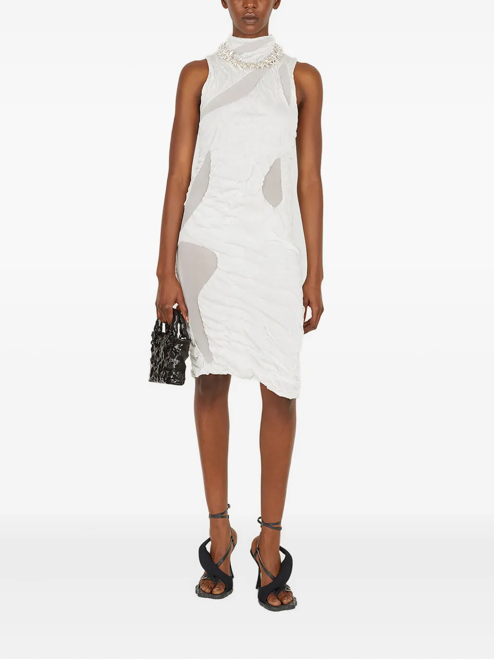 Белый высокий ворот без рукавов прозрачные сетчатые вставки драпированные детали