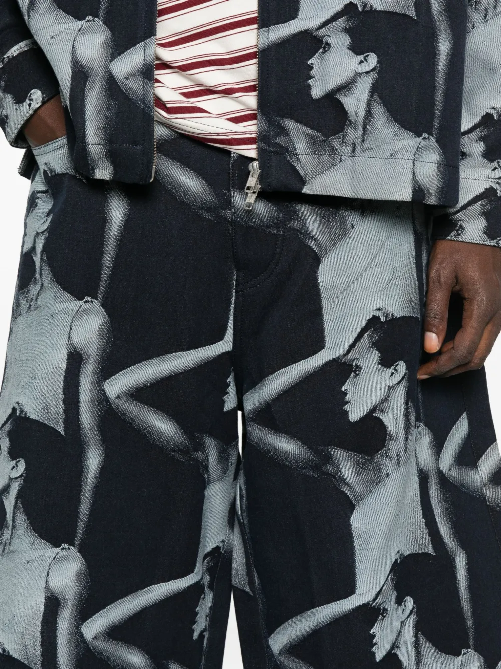 Индиго-синяя джинсовая ткань, дизайн с пятью карманами, графичный принт по всей поверхности, тональная строчка, застежка на пуговицах