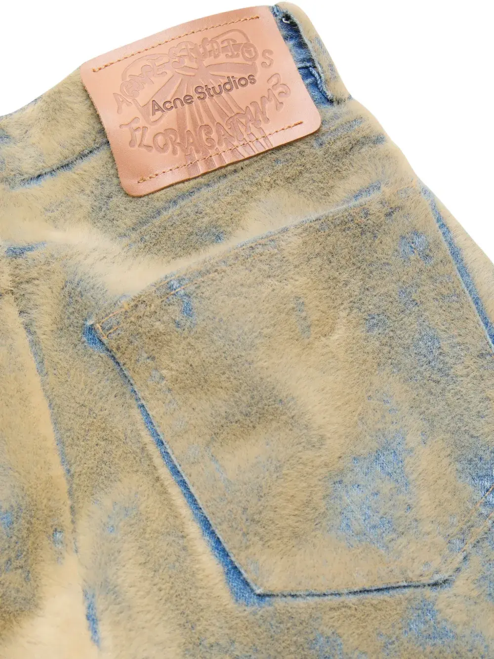 Бежевый деним с текстурированным эффектом, кожаная нашивка, пять карманов, застежка на пуговицах