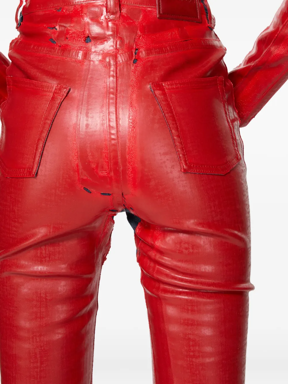 Красные расклешенные брюки с эффектом латекса, завышенной талией и потертостями